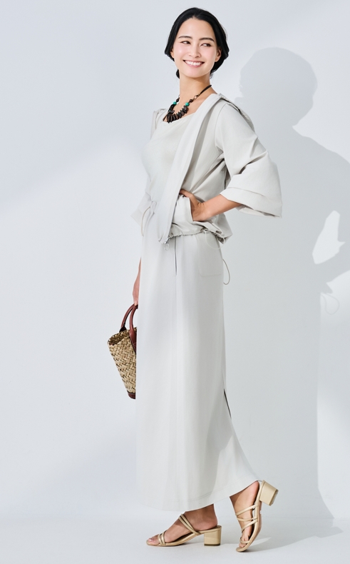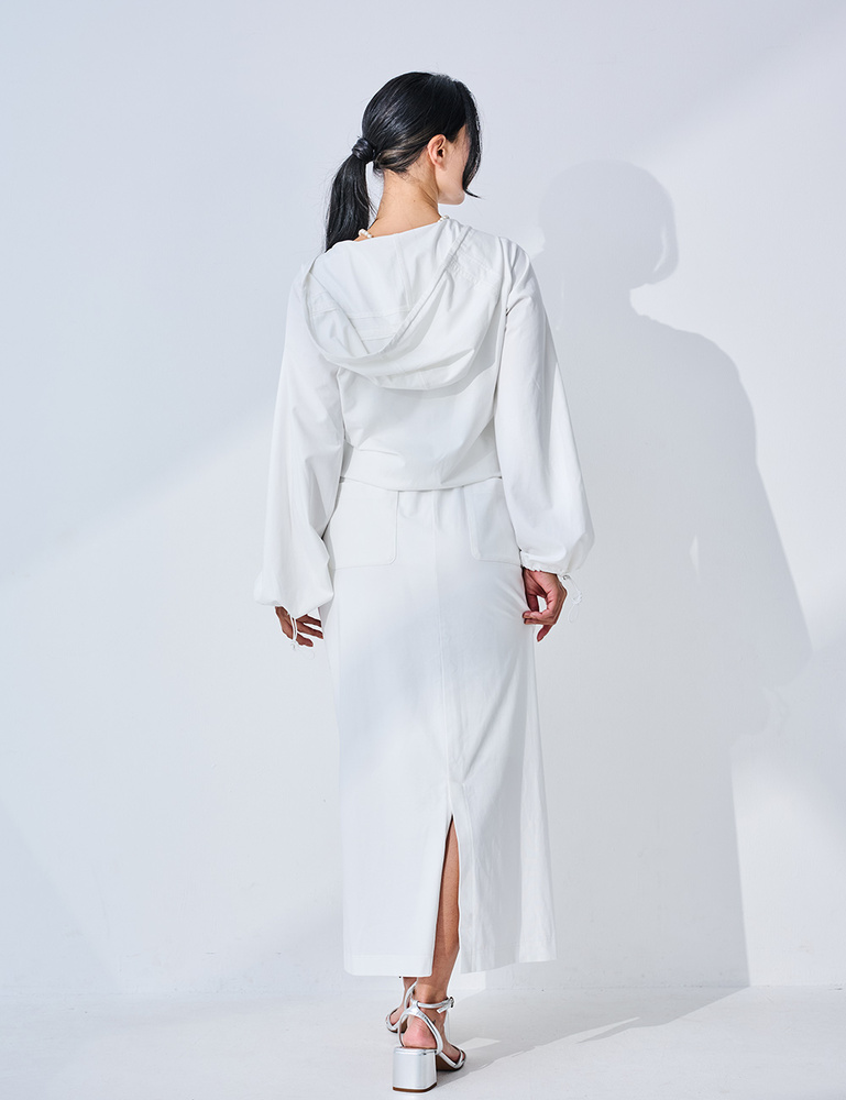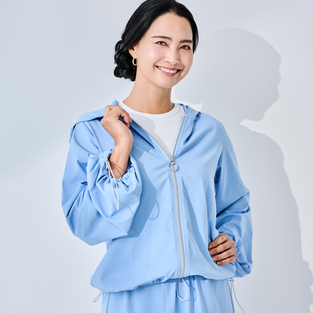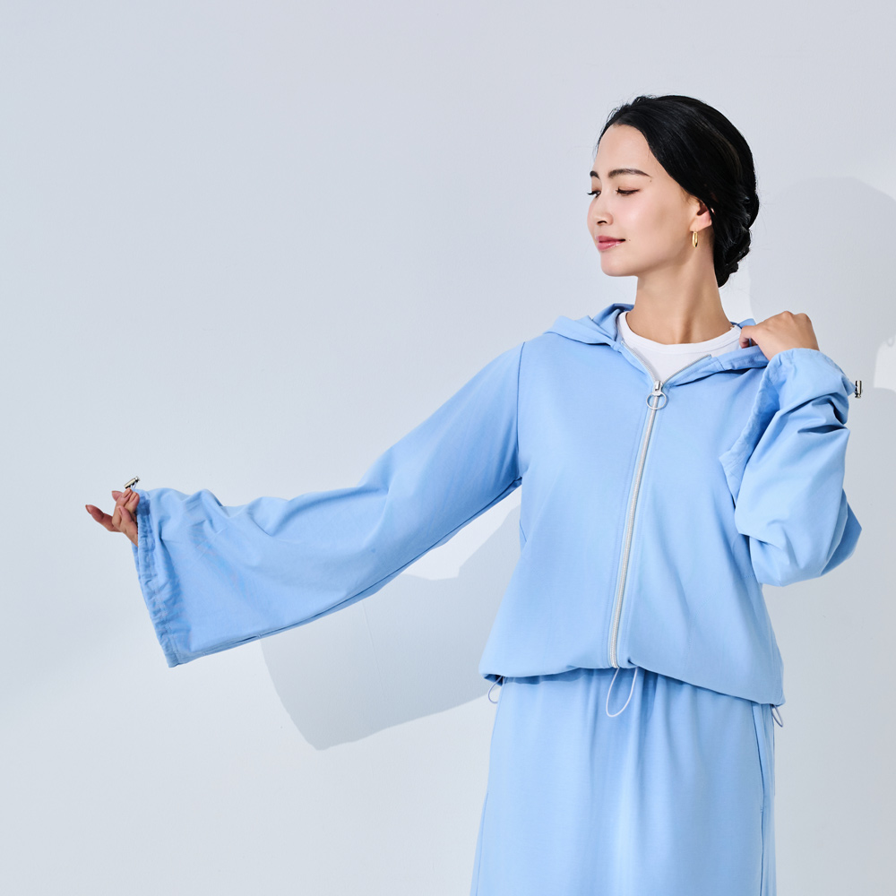 レアメタルセラミック微粒子CWO(R)と酸化チタンを練り込んだ糸を用いたハイブリッド素材「トゥルーボーテ(R)」のパーカーとスカートは、紫外線に加え近赤外線も約80%以上カット。オシャレを楽しみながらも、夏の日差し対策に抜かりなし。商品画像の説明。