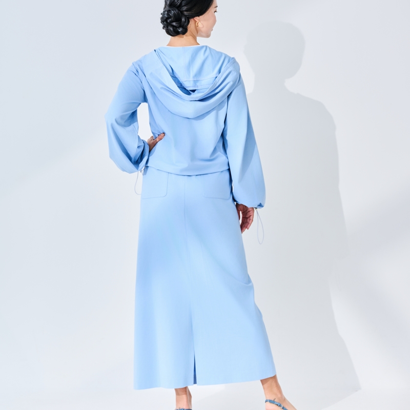 ブルー 大きなフードは深く被ることができ、後ろには髪を出せるホール付き。 袖、裾にはアジャスターが付いているので、さまざまなシルエットが楽しめます。
