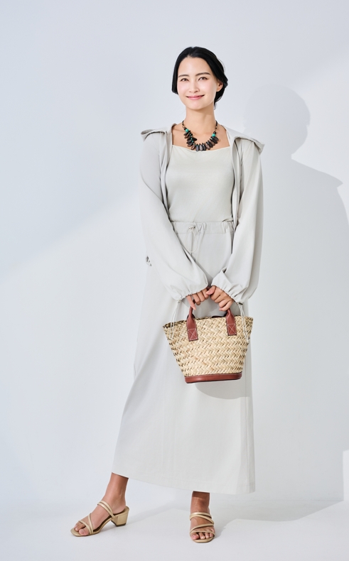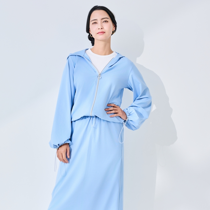 レアメタルセラミック微粒子CWO(R)と酸化チタンを練り込んだ糸を用いたハイブリッド素材「トゥルーボーテ(R)」のパーカーとスカートは、紫外線に加え近赤外線も約80%以上カット。オシャレを楽しみながらも、夏の日差し対策に抜かりなし。