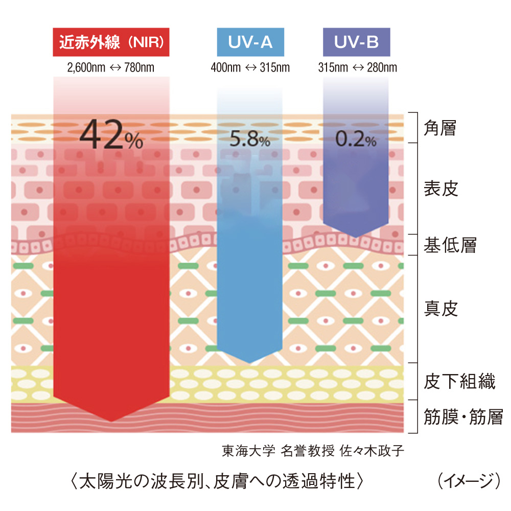 • 【近赤外線の特徴と肌への影響】太陽光に含まれる光のエネルギーのうち、約42%が近赤外線であり、私たちの皮膚の深部まで到達する特徴があり、光老化やシミ・シワの原因となると言われています。