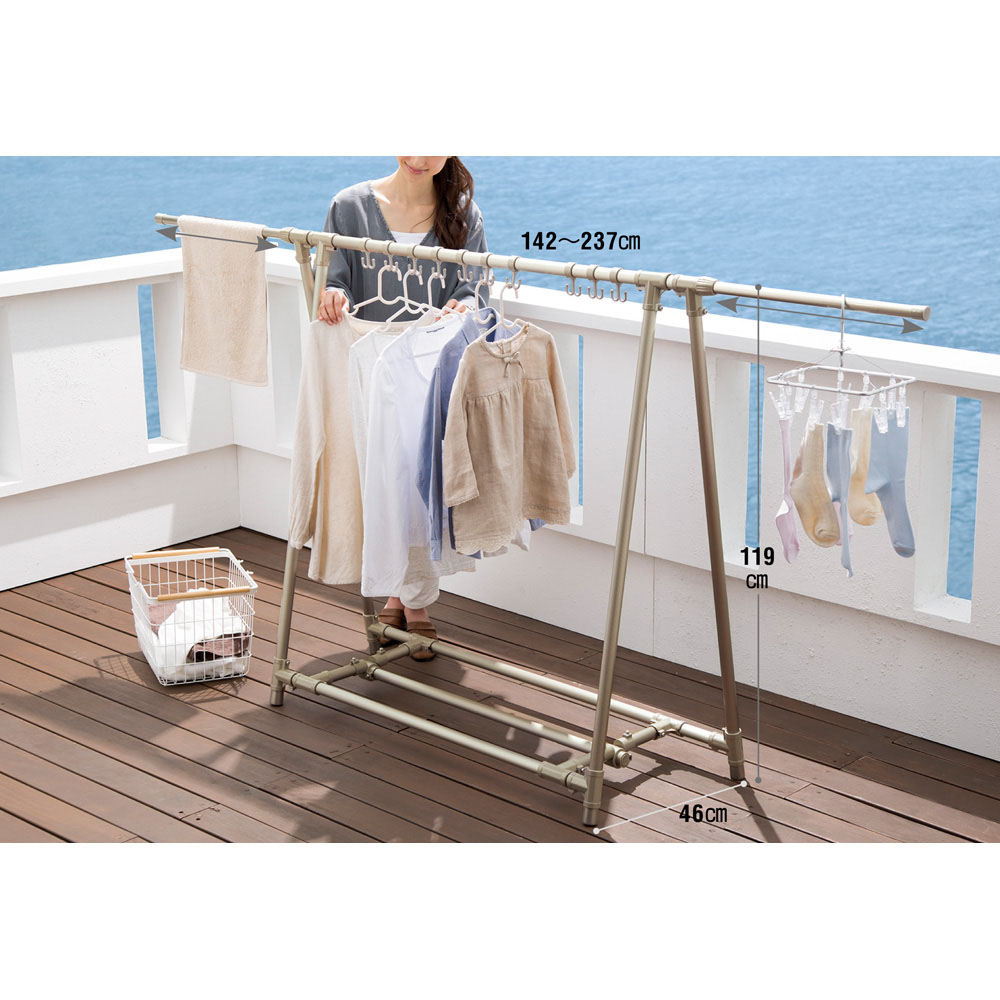 狭いベランダや屋内にも設置できる、奥行わずか46cmのA型物干し。伸縮レギュラータイプは、幅は最大237cmまで伸ばせ、ハンガーフックも10個付いているので大量干しにも便利。布団は横からスライドさせて干すことができ女性でもラクチン!約3kgと軽くて丈夫なアルミ製で持ち運びも簡単。使わないときはワンタッチで折り畳み可能です。