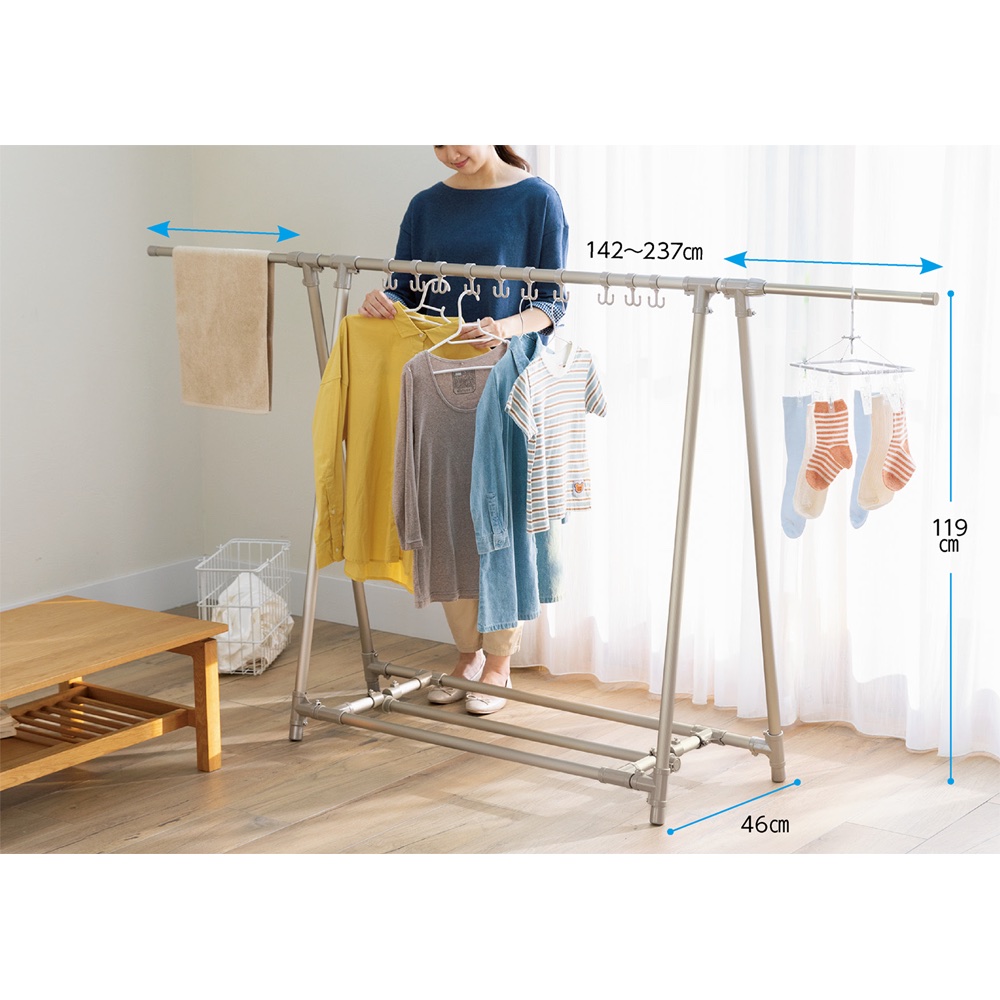 横からスライドさせて干すことにより楽に干せ、伸縮レギュラータイプは最大237cmまで伸びます。