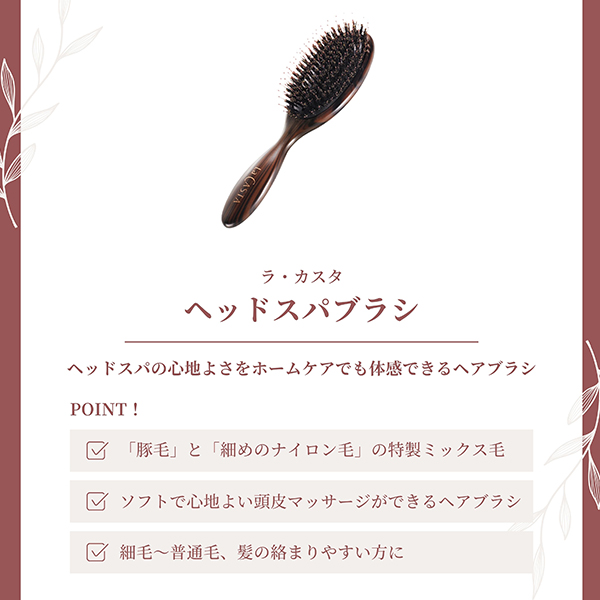 ラ・カスタ オフィシャル ヘッドセラピストがプロデュースして開発された特製のミックス毛(豚毛・ナイロン毛)を使用しています。