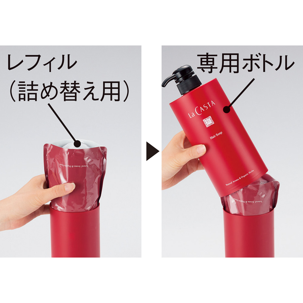 • カートリッジ式で無駄なく使えて衛生的。専用容器に入れてカバーするだけ、手を汚さずにセット完了。真空状態になる新形状のリフィルです。(※写真はヘアソープです)