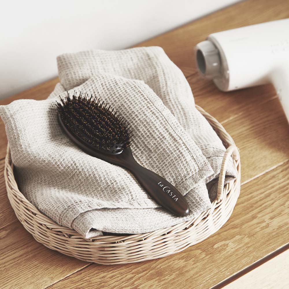ツヤを出したいときにおすすめの豚毛とナイロン毛の特性ミックス毛ブラシ。長さの異なるミックス毛とこだわりの配列で髪と頭皮を同時にケアできます。