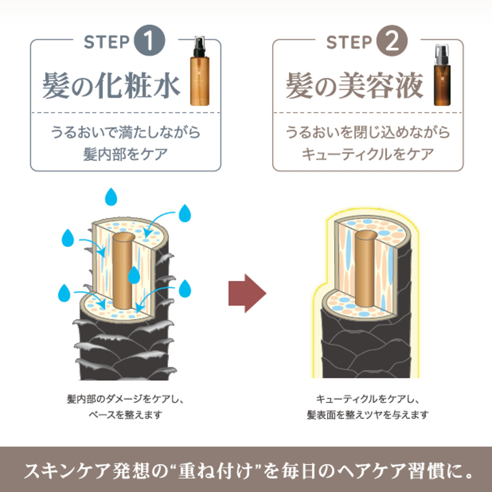 ヘアローションの後に洗い流さないヘアトリートメントを重ね付けしていただくと、より美しい髪に仕上がります。