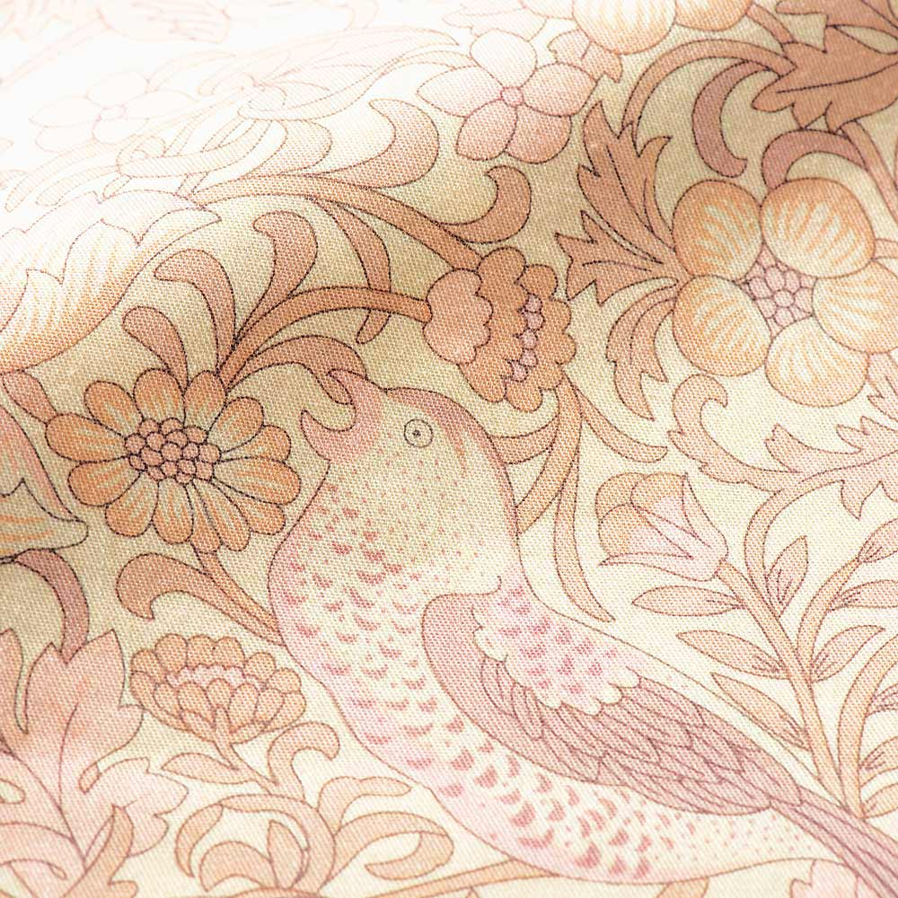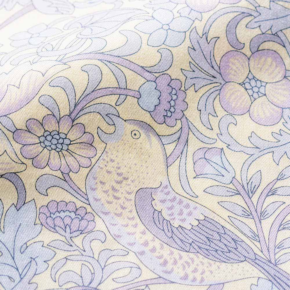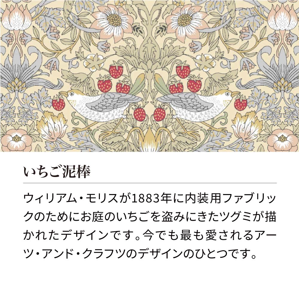 ウィリアム・モリスが1883年に内装用ファブリックのためにお庭のいちごを盗みにきたツグミが描かれたデザインです。今でも最も愛されるアーツ・アンド・クラフツのデザインのひとつを大人の寝室にふさわしい色と素材でカバーリングに落とし込みました。商品画像の説明