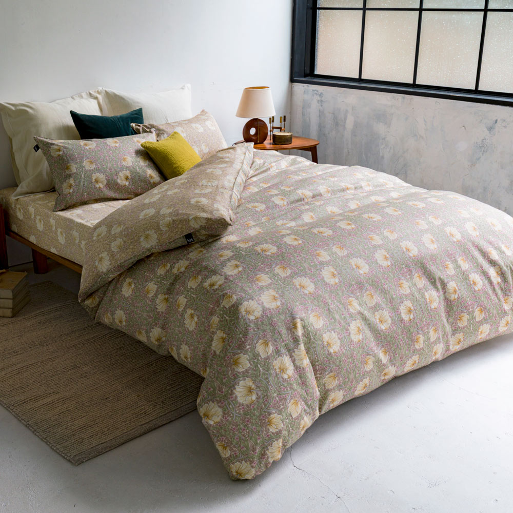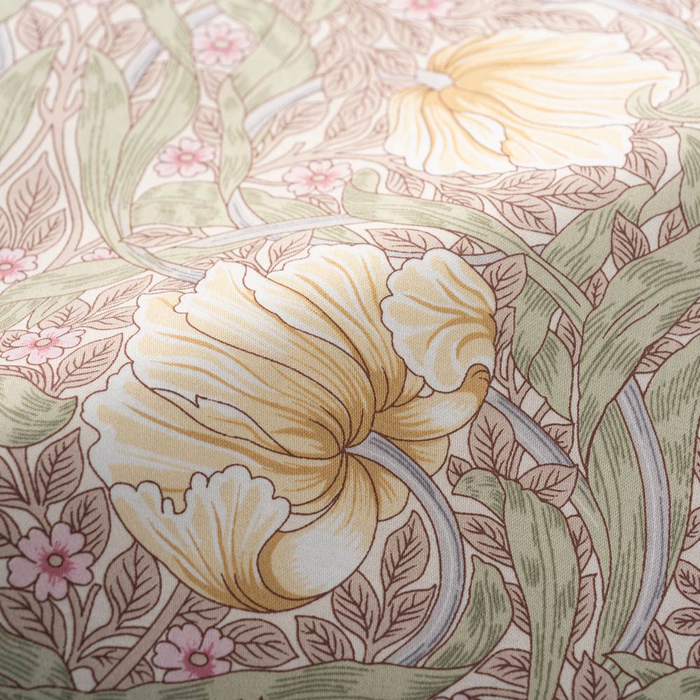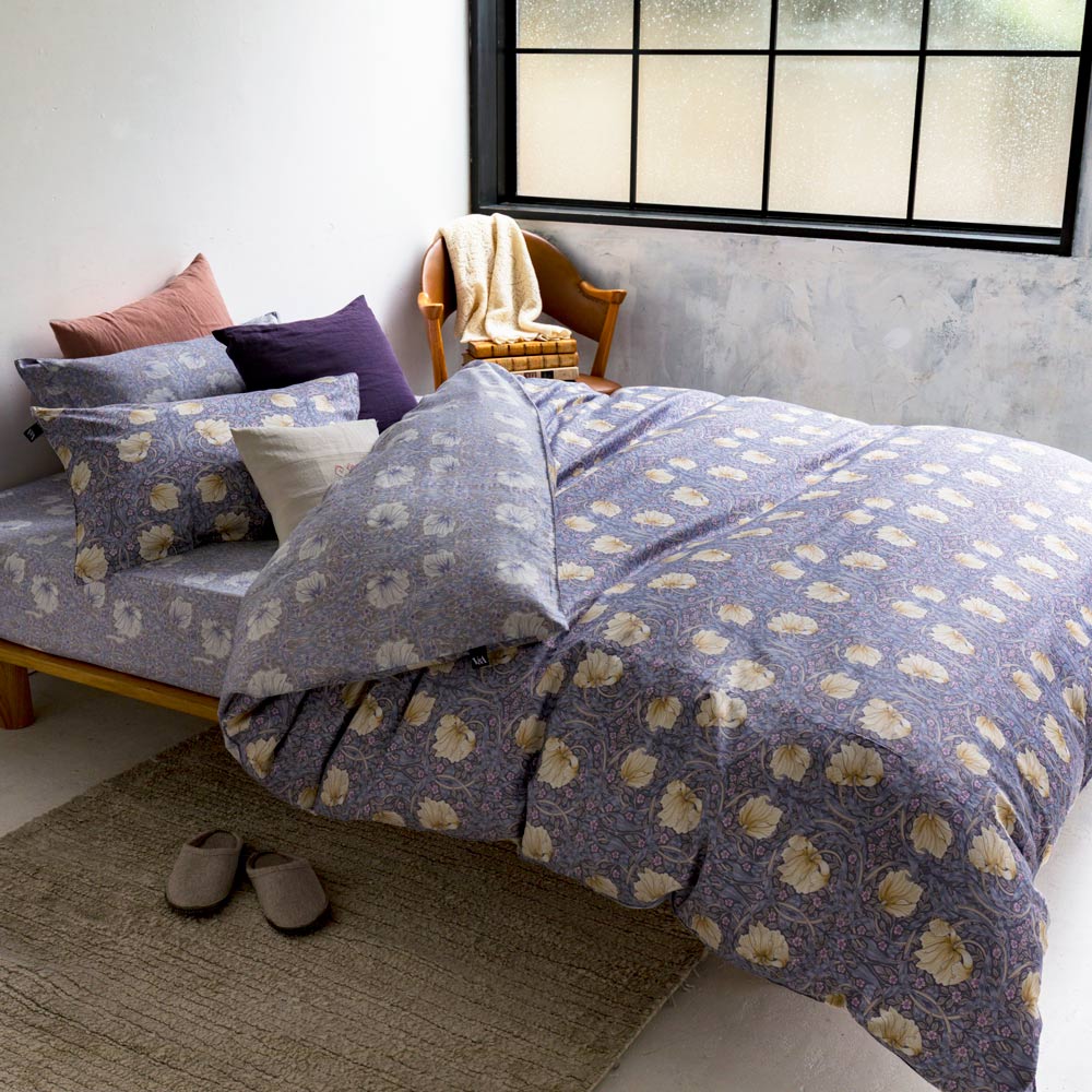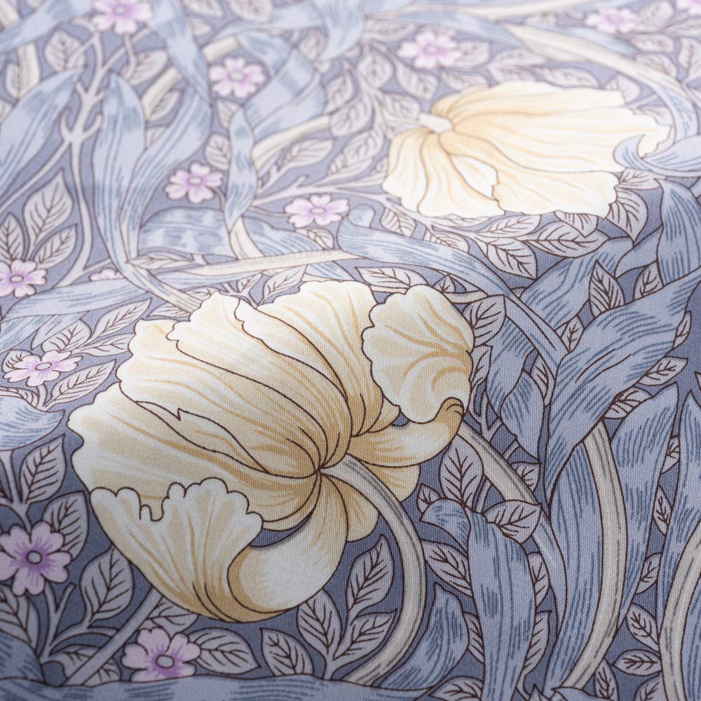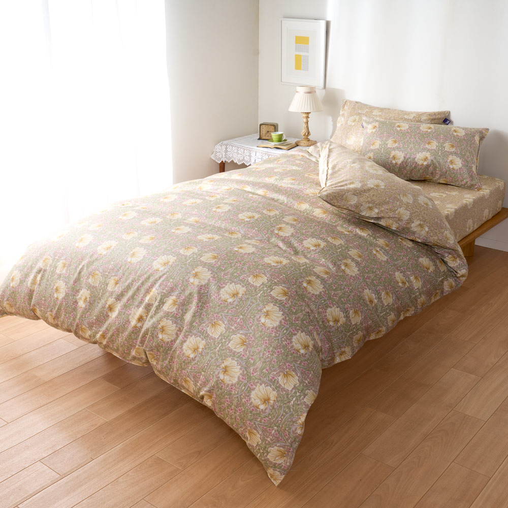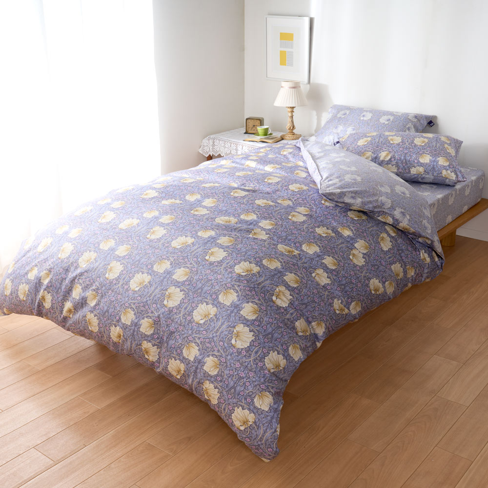 イギリスを代表するテキスタイルデザイナー、ウィリアム・モリスによる可憐なピンパーネル柄のベッドシーツです。上品な可愛らしさ漂う色柄で、寝室を癒しの空間に。なめらかで肌ざわりの良い綿100%の上質なサテン生地で、季節を問わず気持ちよくお使いいただけます。