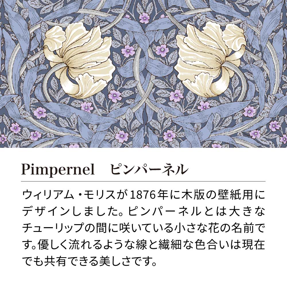 ウィリアム・モリスが1876年に木版の壁紙用にデザインしました。ピンパーネルとは大きなチューリップの間に咲いている小さな花の名前です。優しく流れるような線と繊細な色合いは現在でも共有できる美しさです。