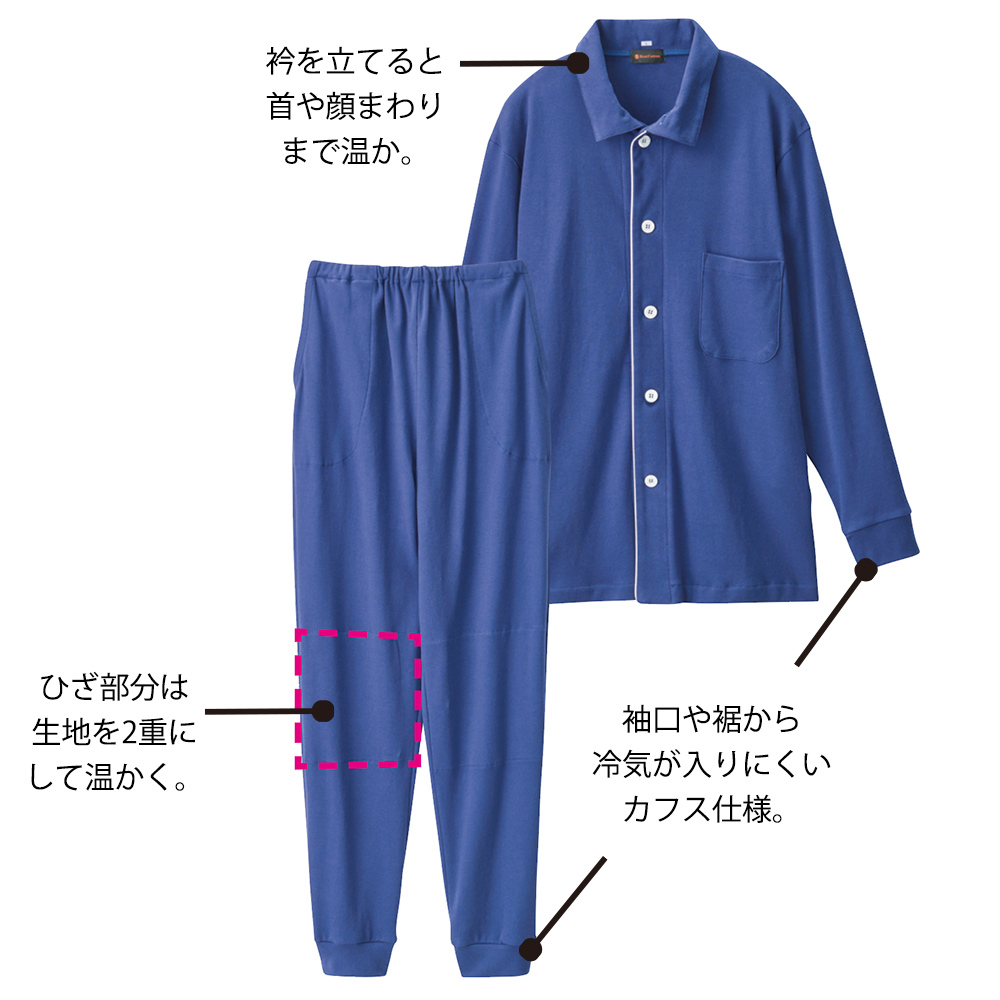 綿ニットのやわらかな生地で着心地も寝心地も快適です。綿が持つ高い保水力で肌を乾燥から守ります。3首あったか仕様+ひざあて付き