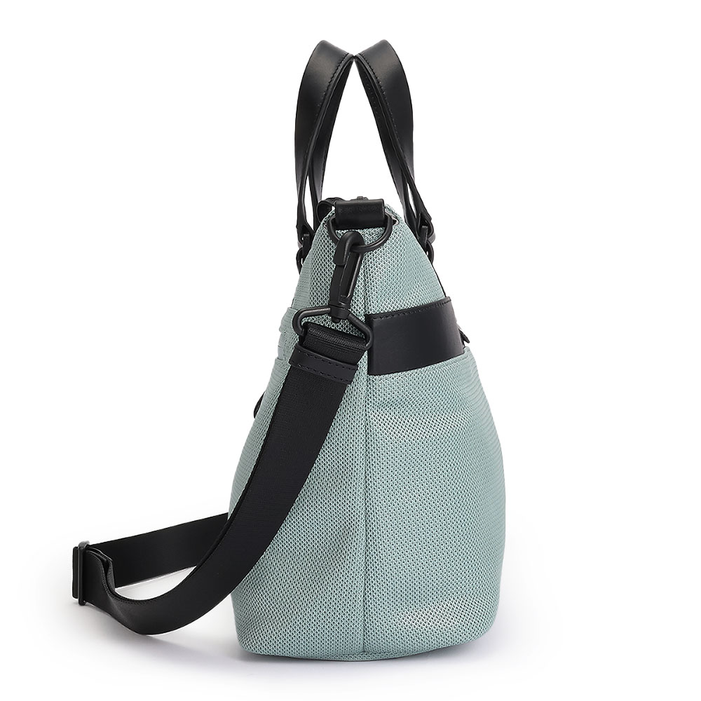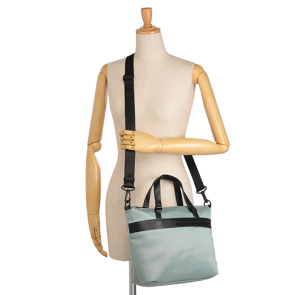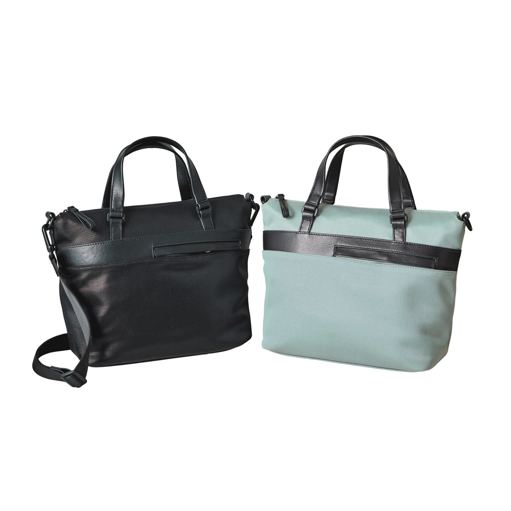 アクティブな日にはショルダーバッグをセレクト。メッシュ調のポリエステル生地を使用し、ラグジュアリーな光沢感を演出。取り外し可能のショルダーストラップつきです。シンプルなデザインながら、ファスナーデザインとレザーがアクセント。どんなシーンにも合わせやすく、収納力に優れた2WAYバッグです。