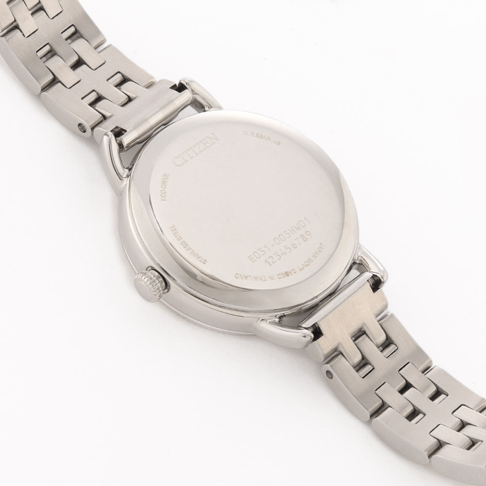 星空の輝きをイメージしたラメ入りの文字盤に6石のダイヤが瞬くデザインが華やか。光で動くエコ・ドライブ搭載。商品画像の説明