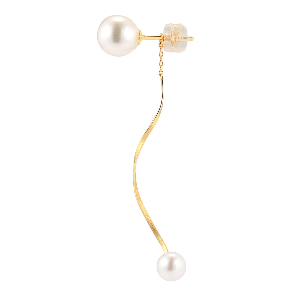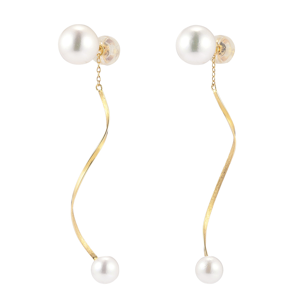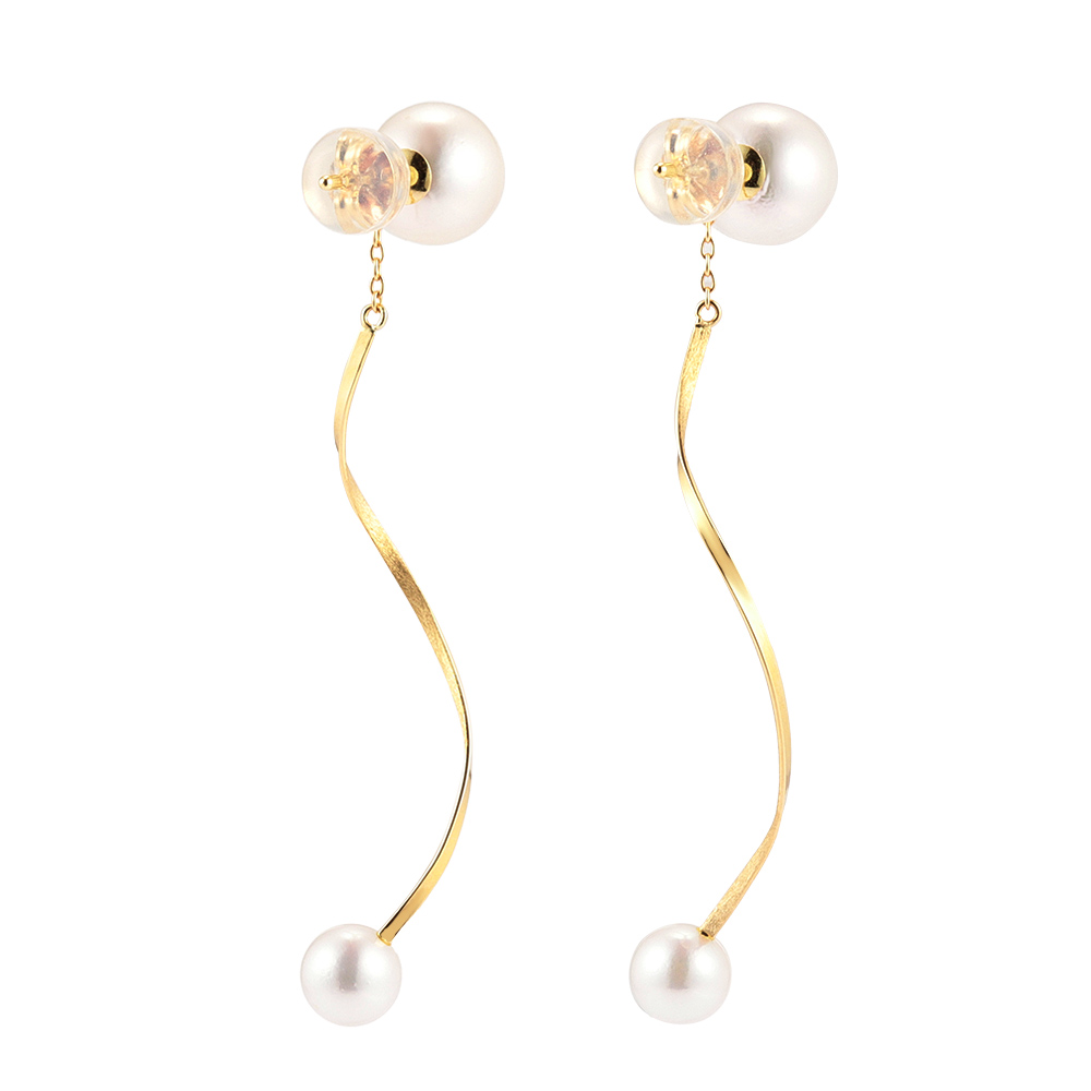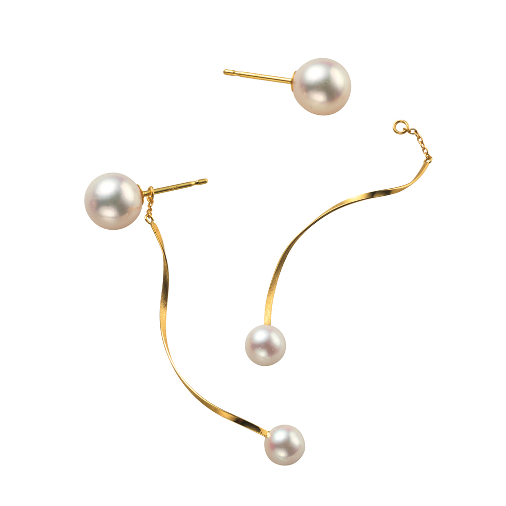 上質なアコヤパールを用いたピアス。 スパイラル状のバーの上下にパールをセット。バーを外してひと粒ピアスとしても。商品画像の説明