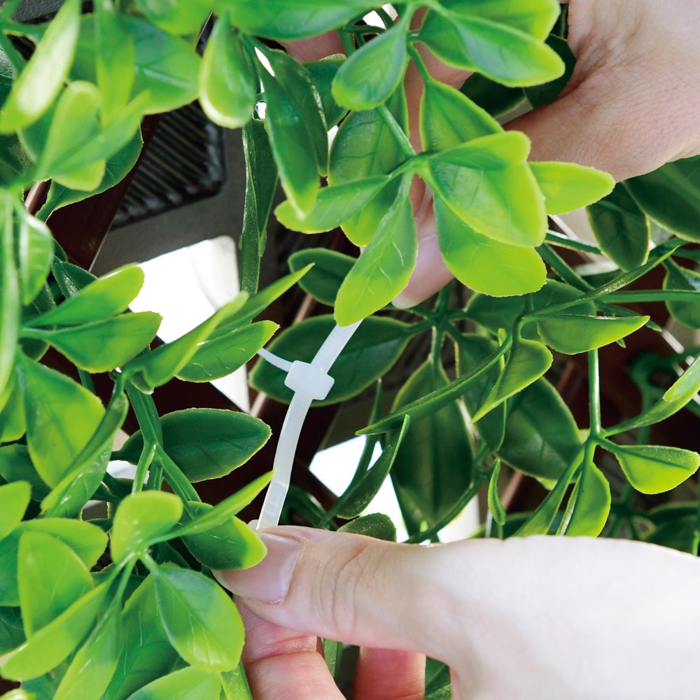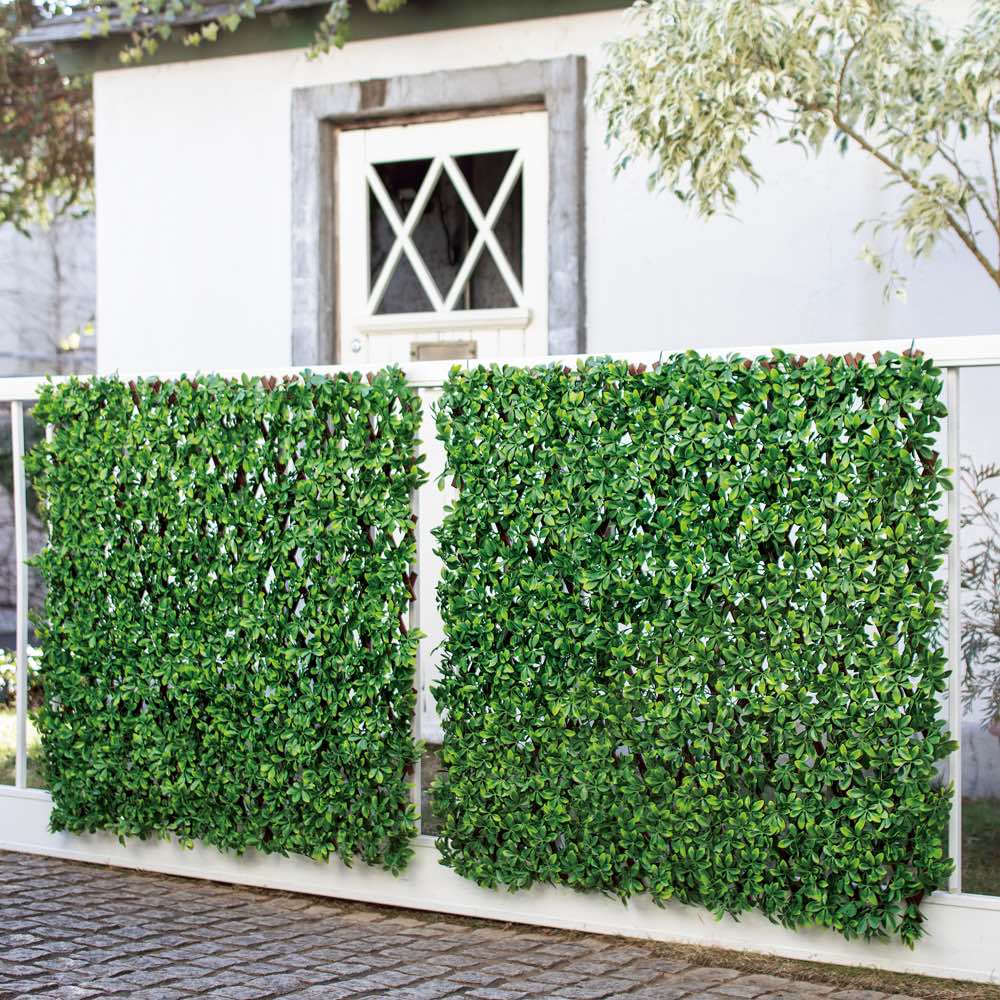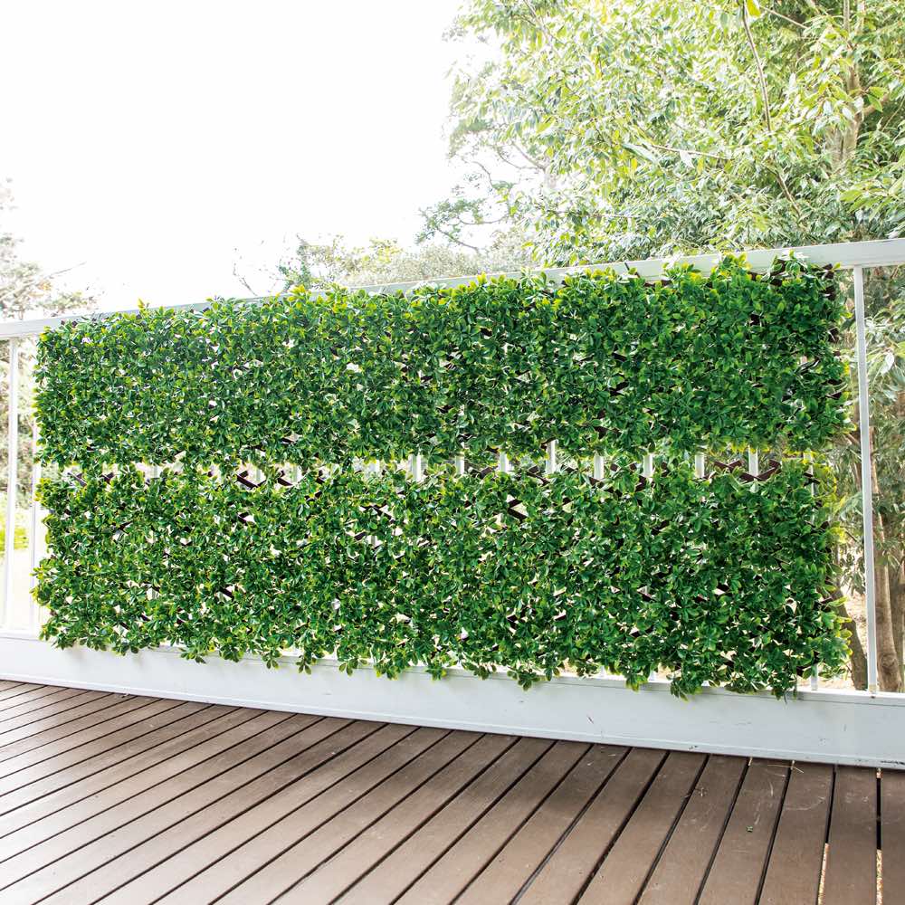 取付場所に合わせて格子フレームが縦横に伸び縮み。ベランダの柵やフェンスの目隠しに。密集した葉は視線カット効果が高く、フェイクだから水やりも虫の心配も不要。
