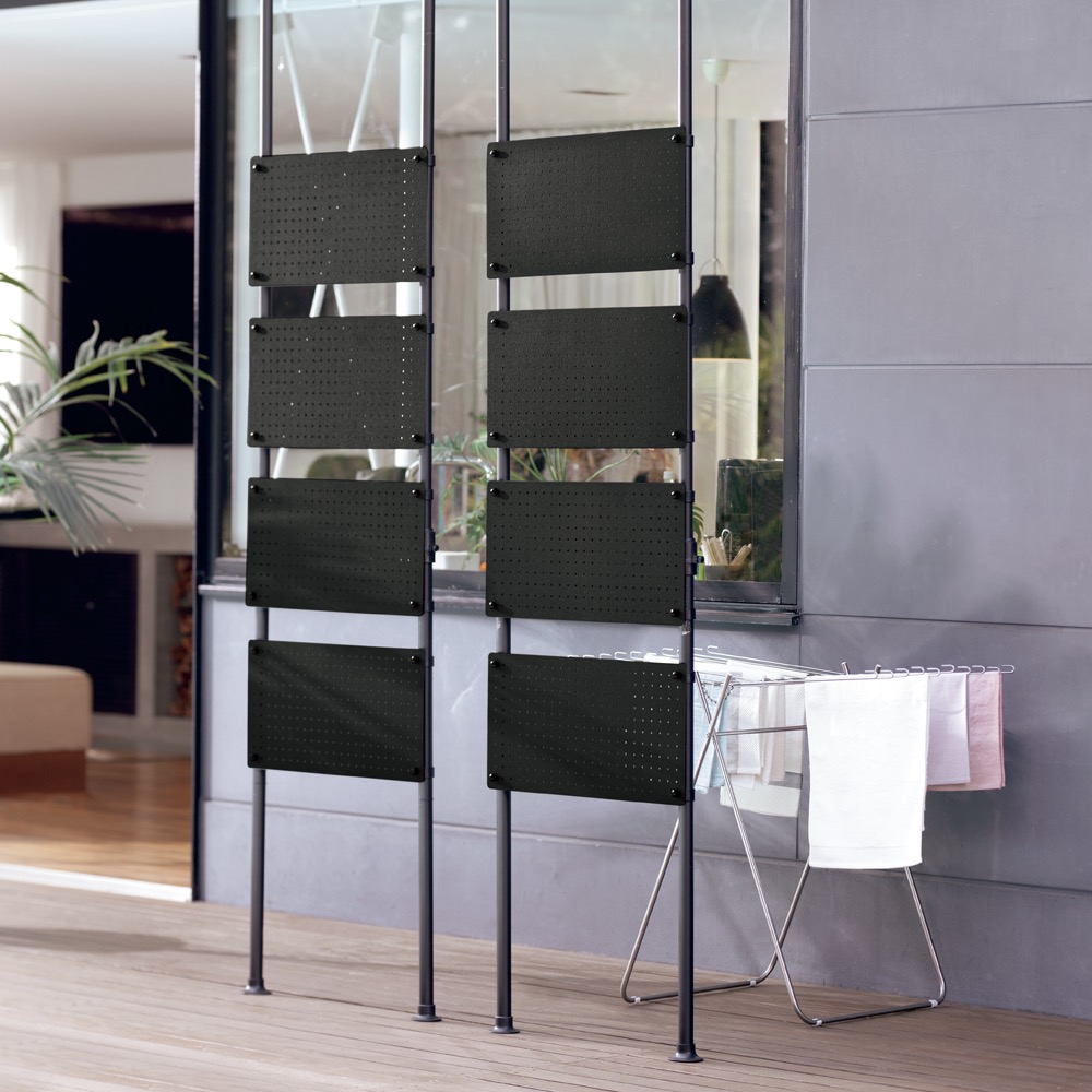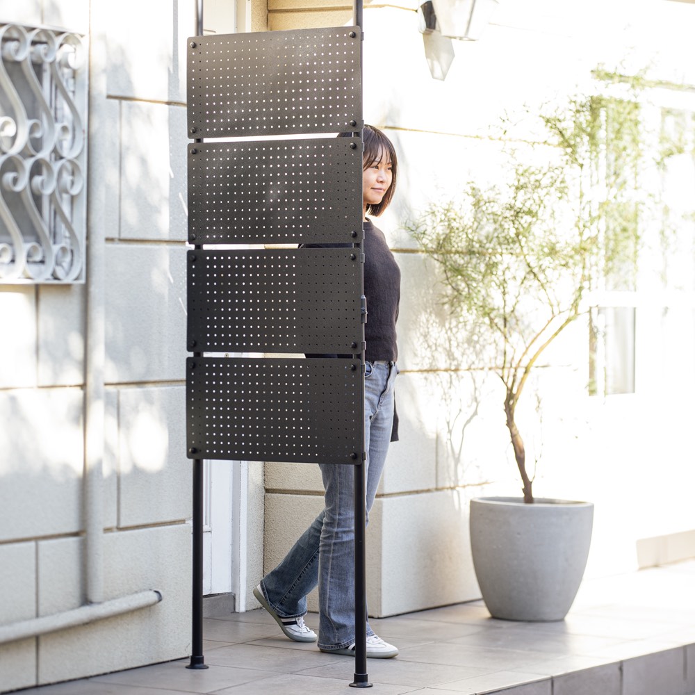くつろぎ着のままの玄関の出入りや、見られたくないベランダの洗濯物に、ワンタッチの簡単突っ張り式。スチール製パンチングボードなので、風や光はほどよく通します。