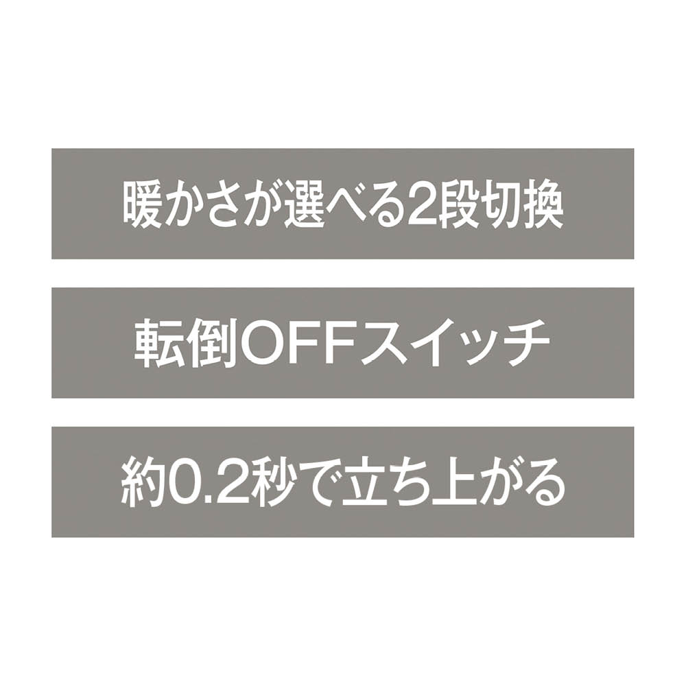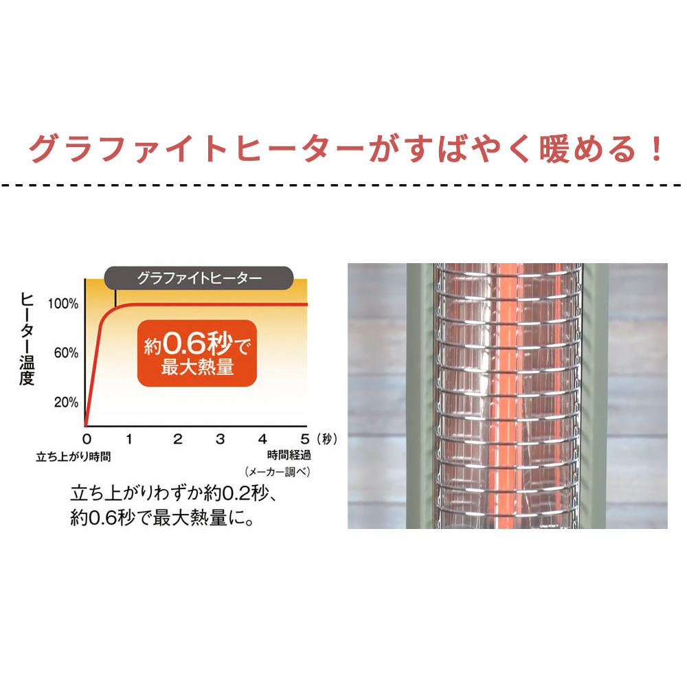 立ち上がりは0.2秒、最大熱量までもたったの0.6秒と、瞬間で暖かさを実感。また、遠赤外線効果で温めてくれます。真冬の帰宅時の冷え切った体にうれしい機能です。