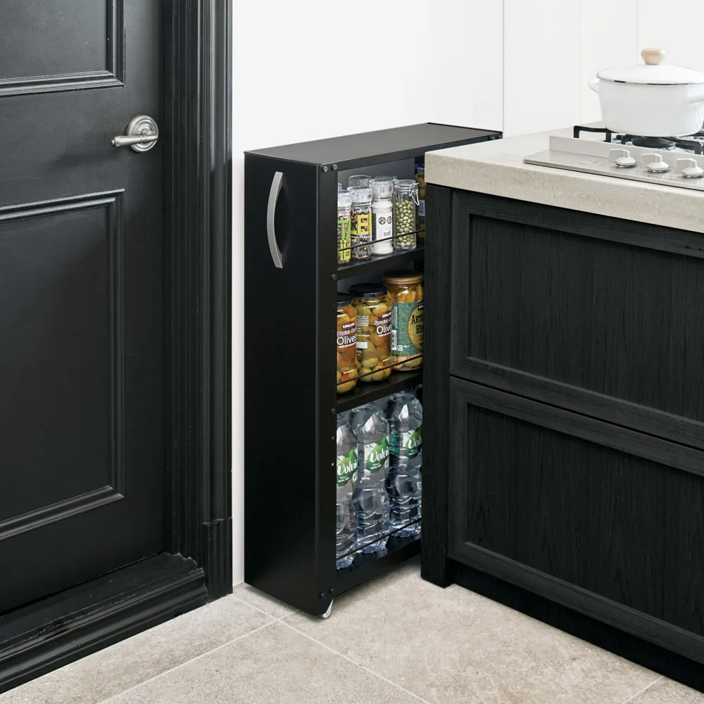 使用イメージ(イ)ブラック スリムなのに大容量。180cmの高さを活かして、調味料からペットボトルまでたっぷり収納できます。 ※写真は別売りのハイタイプ幅15cmです。