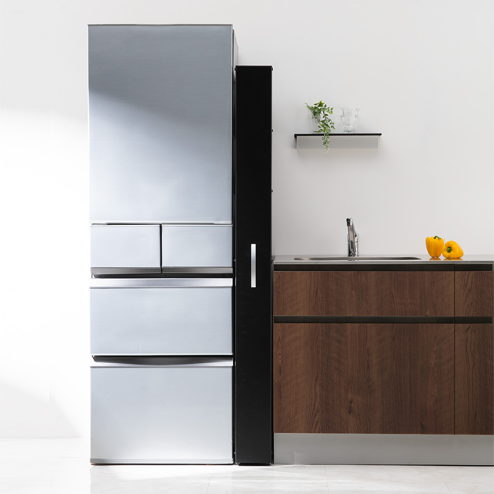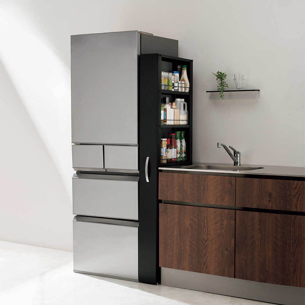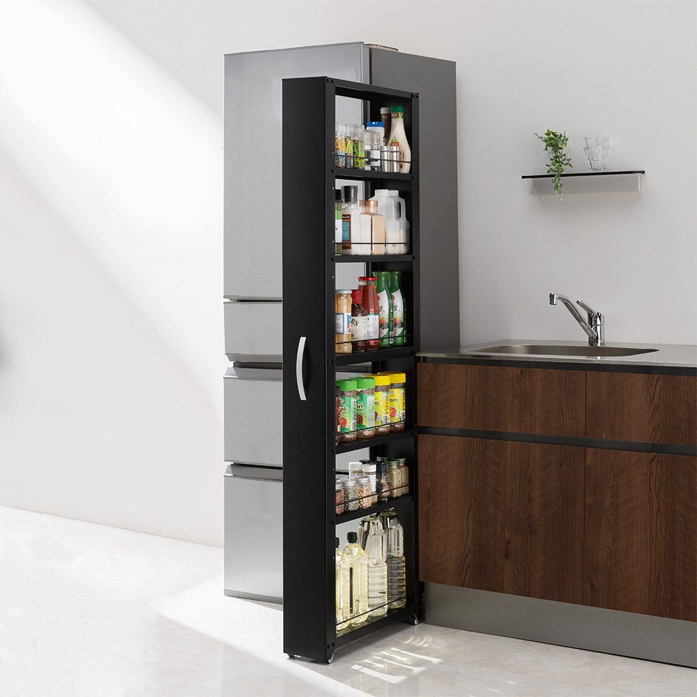 (イ)ブラック スリムなのに大容量。180cmの高さを活かして、調味料からペットボトルまでたっぷり収納できます。