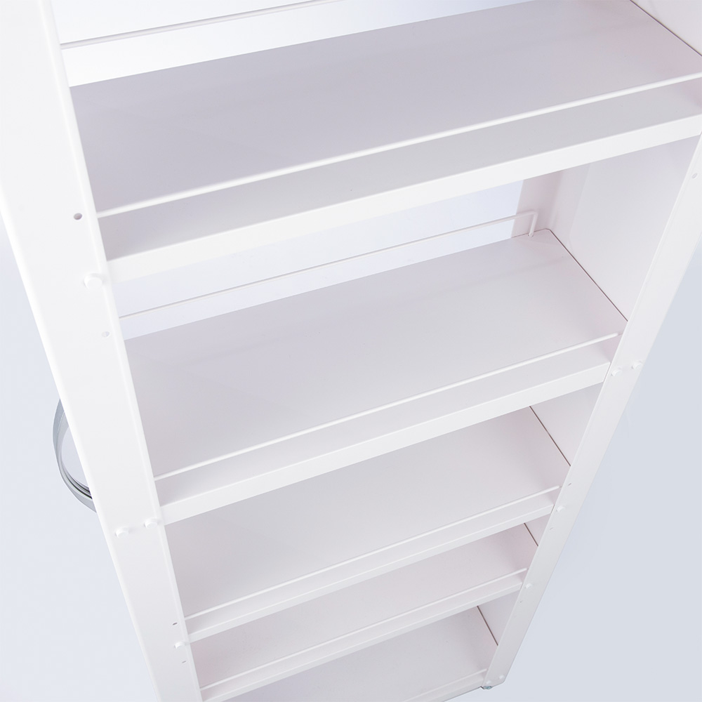 ●棚板1枚当たり約8kgの耐荷重を誇るキッチンワゴンです。●スリムなのに頑丈!さらに使い勝手のよさが自慢。「華奢なストッカーは強度が心配」とお考えの方におすすめです。