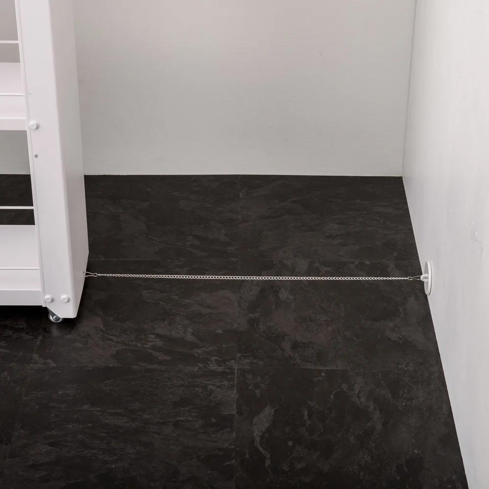 転倒防止金具付き。転倒を防止するために、ワゴンをすき間から完全には引き出さないように、チェーンの長さを調整してください。(約10cm程度はすき間に収まる長さに調節してください)
