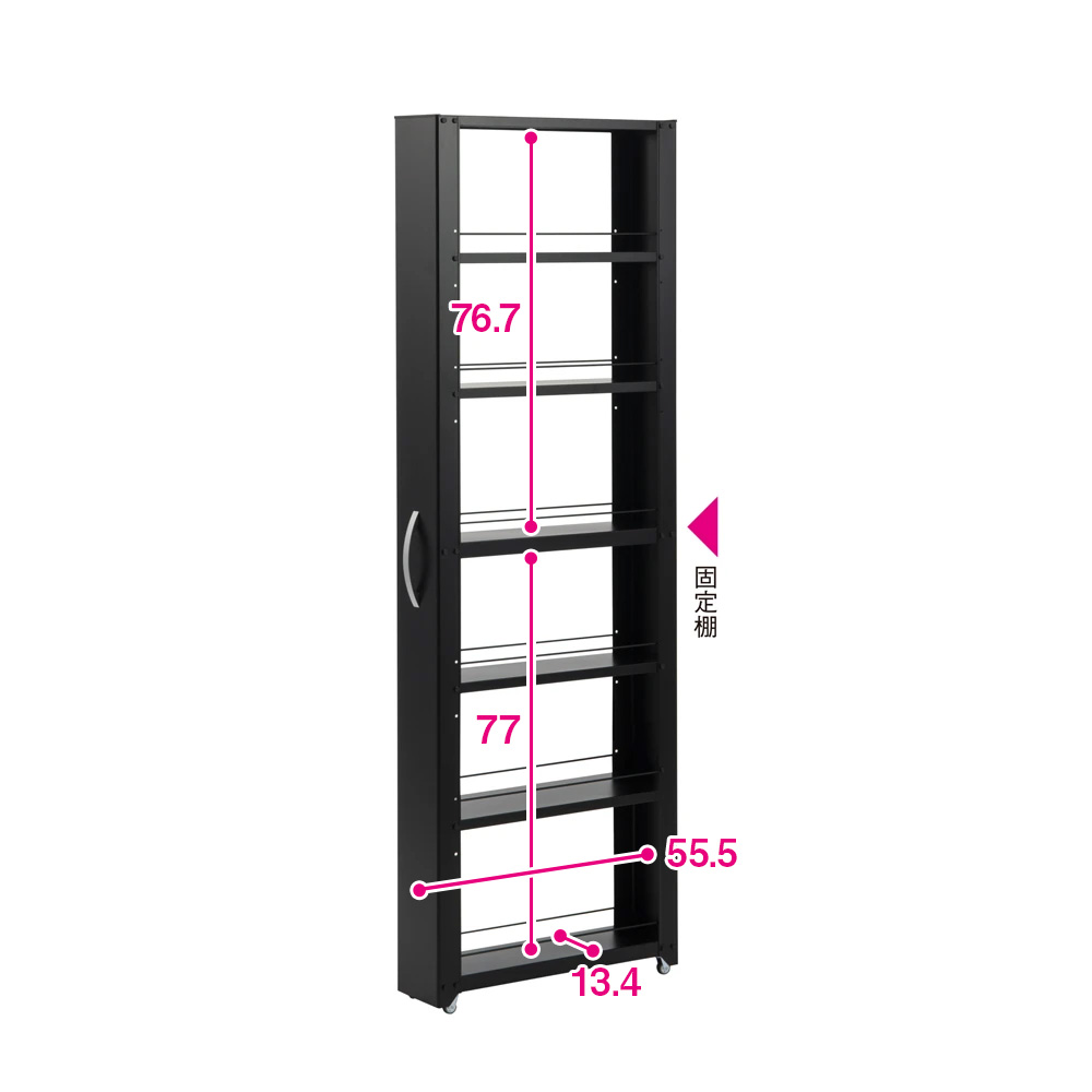 (イ)ブラック 棚板1枚当たり約8kgの耐荷重。総耐荷重は約50kg。キッチンのわずかなスペースに、重いボトルやストック類を心おきなくたっぷり収納できます。