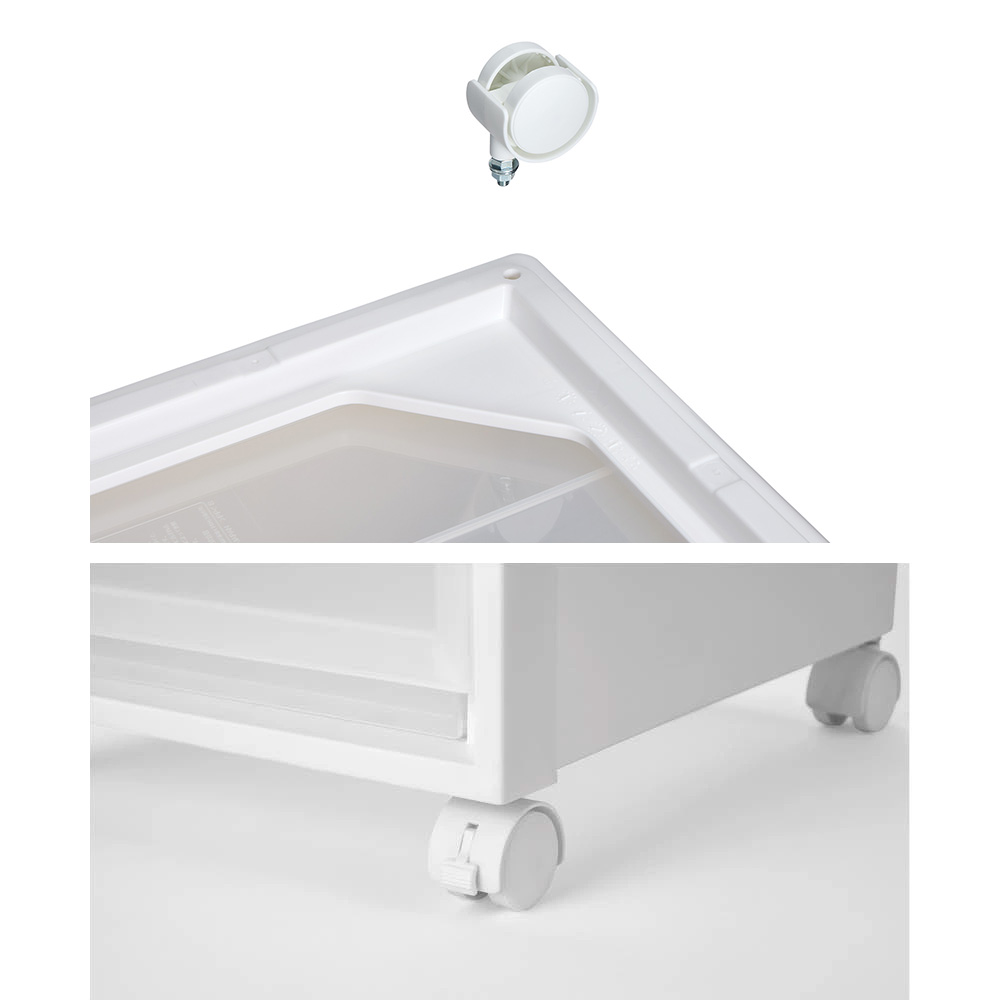 【前倒れ防止機能付き】積み重ねた状態で引出しを引いた時に、ケース後部が浮き上がり前方へ倒れてしまうことを防ぎます。