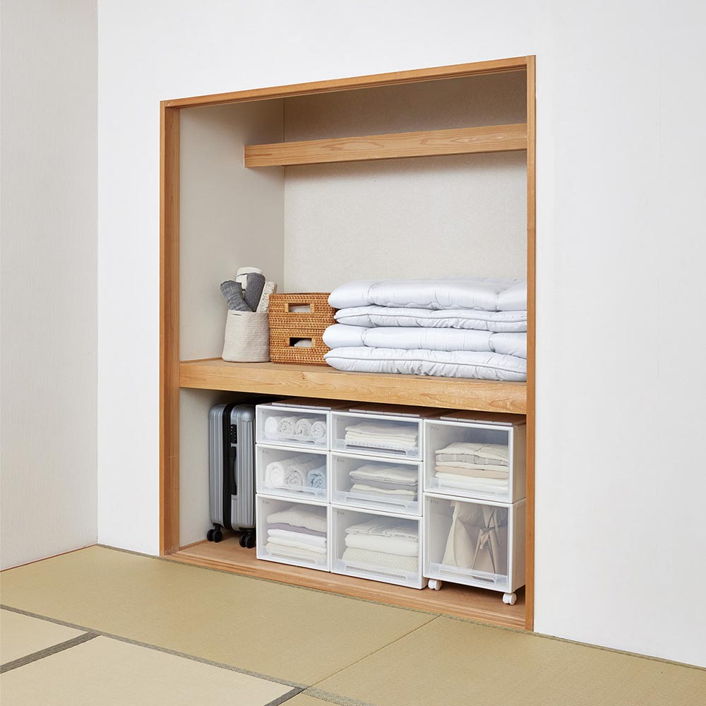 奥行74cmで、押し入れの深さを活かせる大容量。奥行たっぷりだからかさばる厚手の服や、シーツや寝具カバーなどの収納にも大活躍。押し入れにそのまましまうと行方不明になりがちな小物類も、まとめて収納できて便利です。家の中のあらゆる場所で、さまざまなモノの収納に!