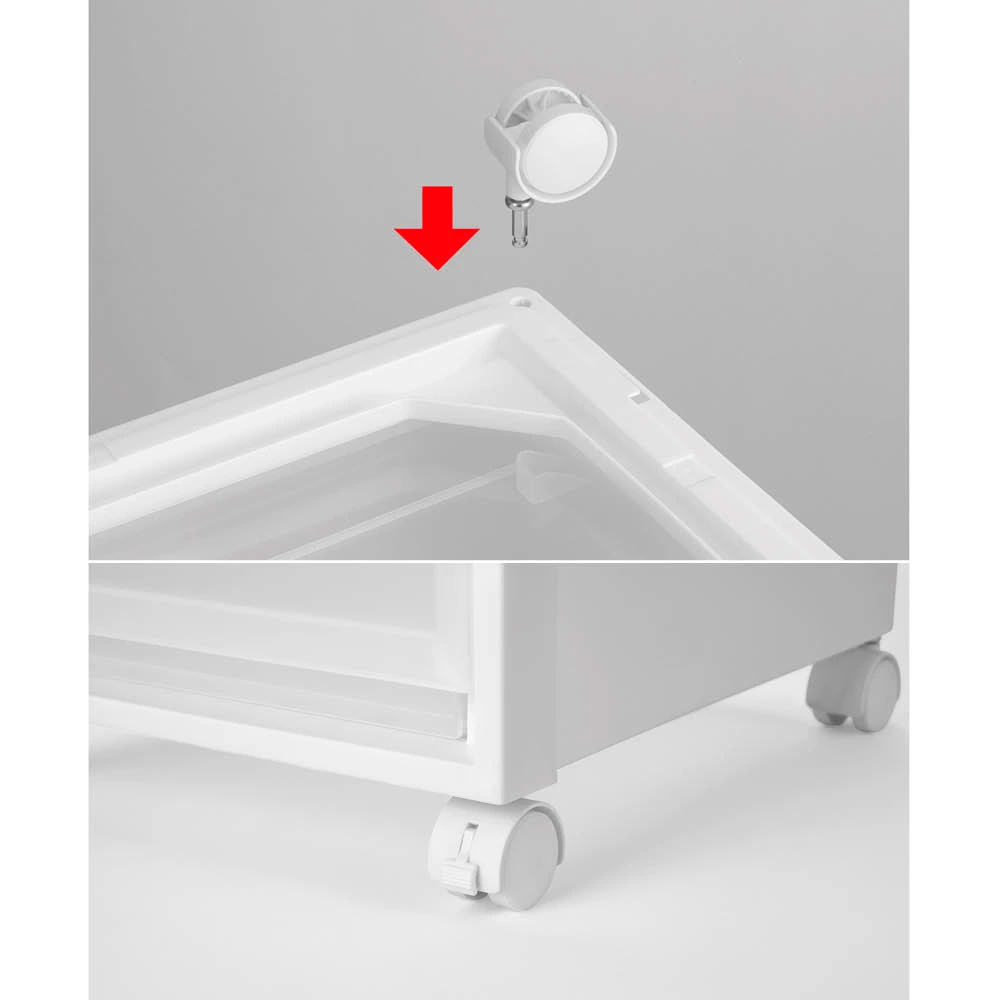【前倒れ防止機能付き】積み重ねた状態で引出しを引いた時に、ケース後部が浮き上がり前方へ倒れてしまうことを防ぎます。