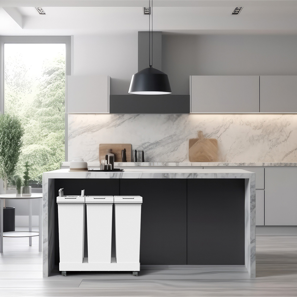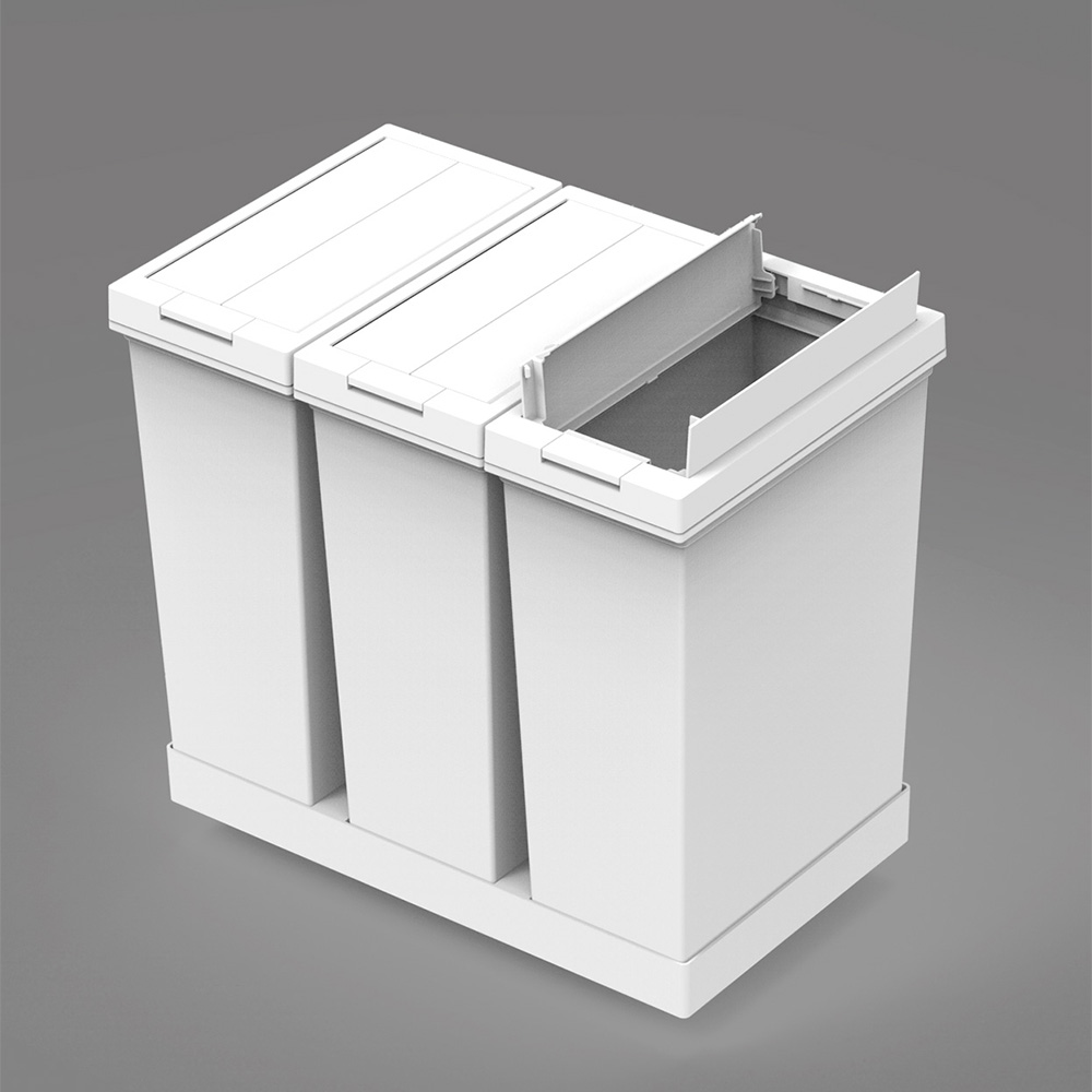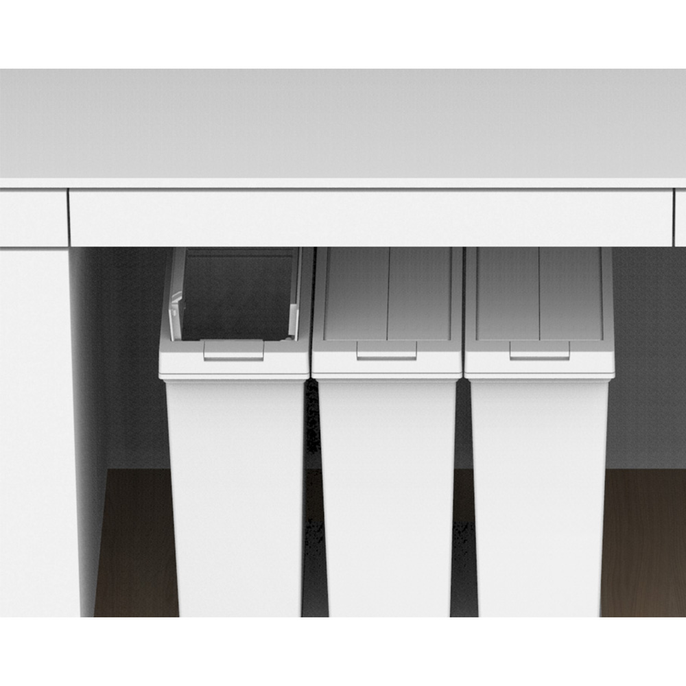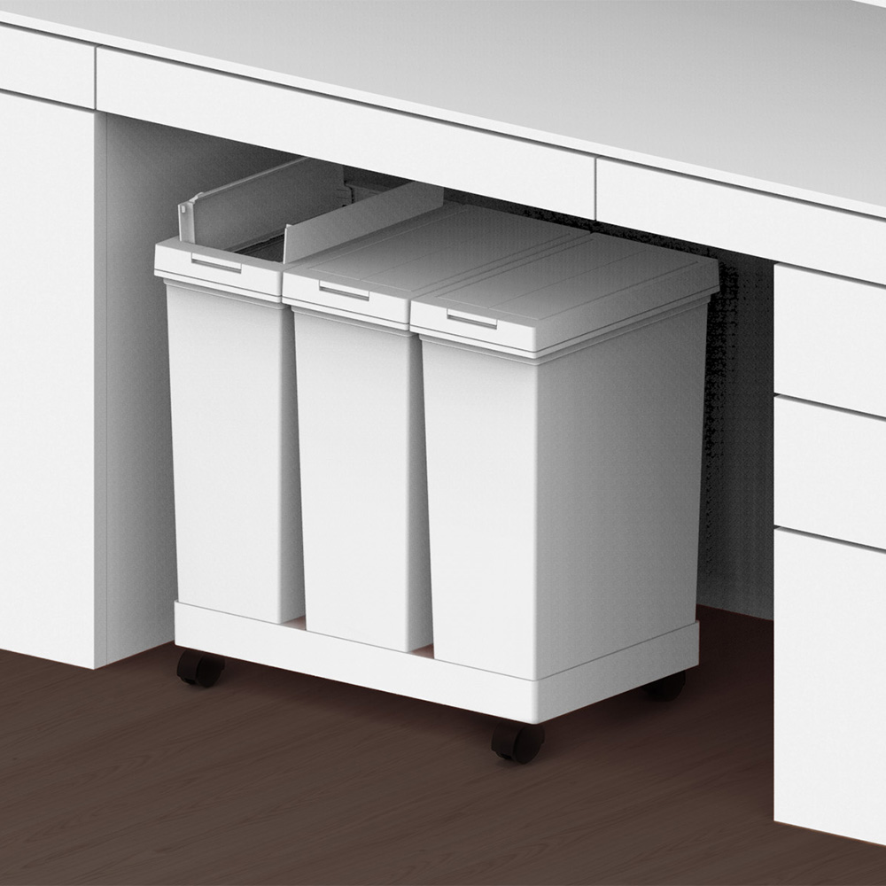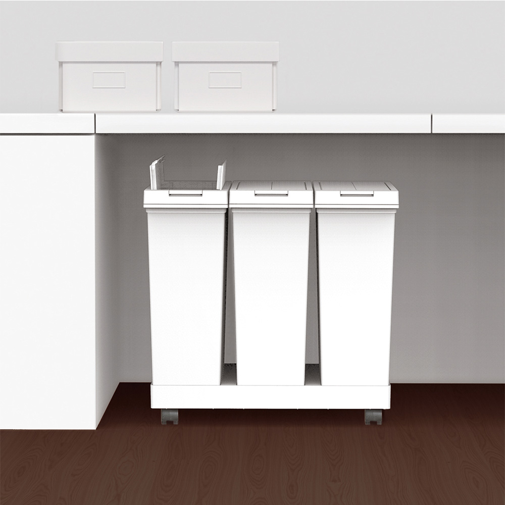 ●20リットルのダストボックスを3つ並べて使う、3分別ダストボックスです。●棚やカウンターの下に置けるよう、開閉時のフタの高さを抑えました。(開けた時の蓋の高さはわずか6cm)