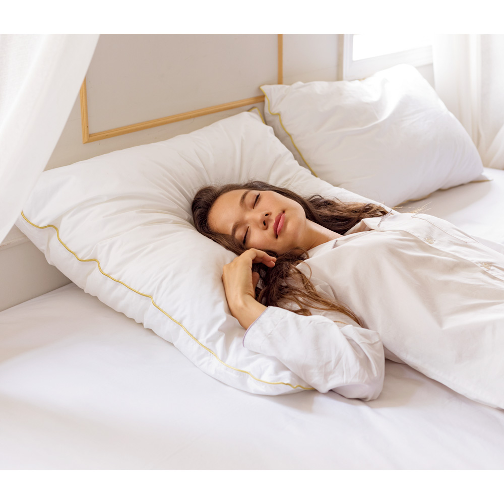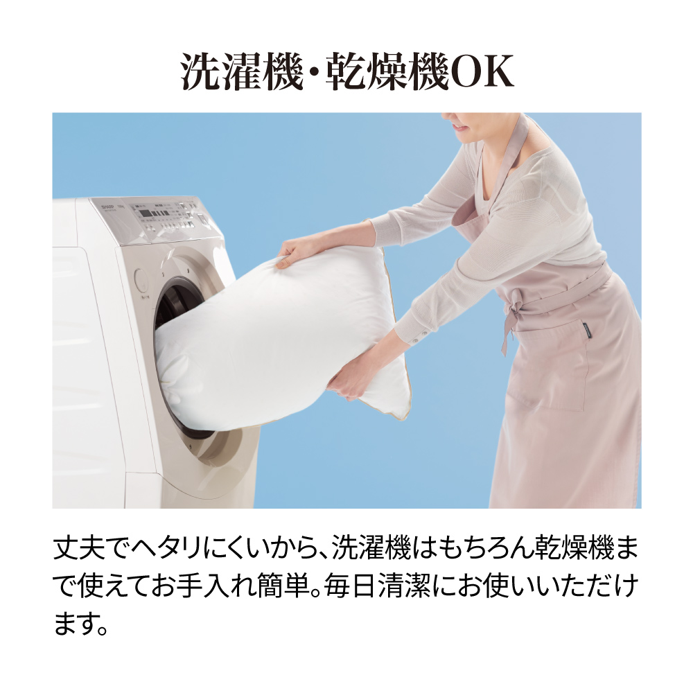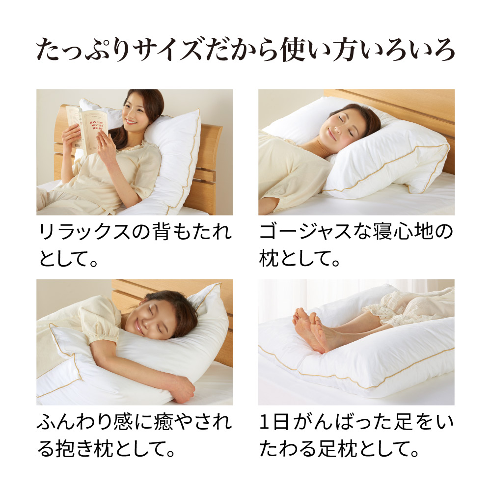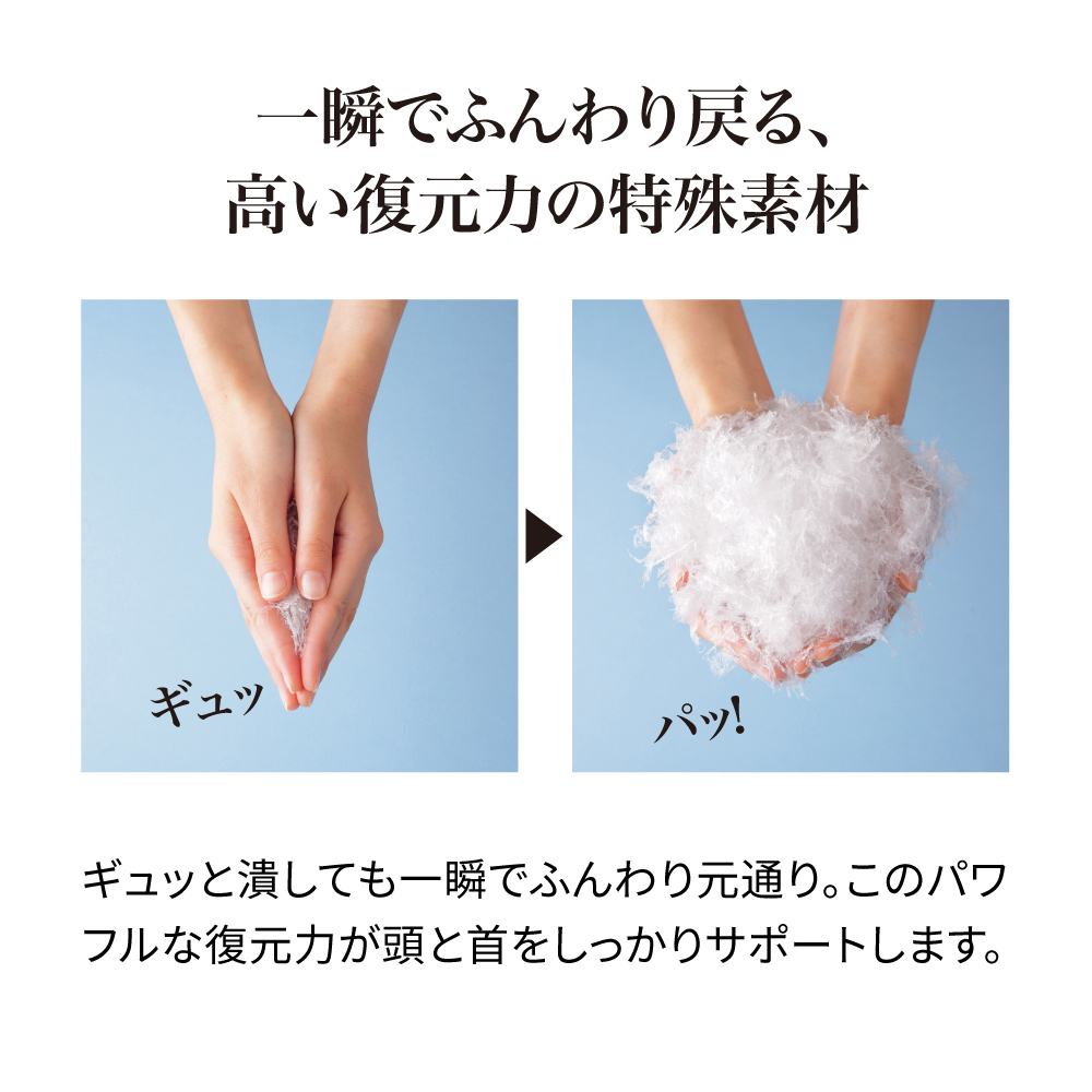 羽毛のようなふわふわ感と、適度な弾力が心地よい中わたが、首・肩周りから頭までをしっかりサポート。海外ホテルさながらのゆったりサイズなので、身体全体をあずけるとまるで枕に包まれるような安心感。リラックスタイムも就寝時も、心身がゆるりとほどけます。