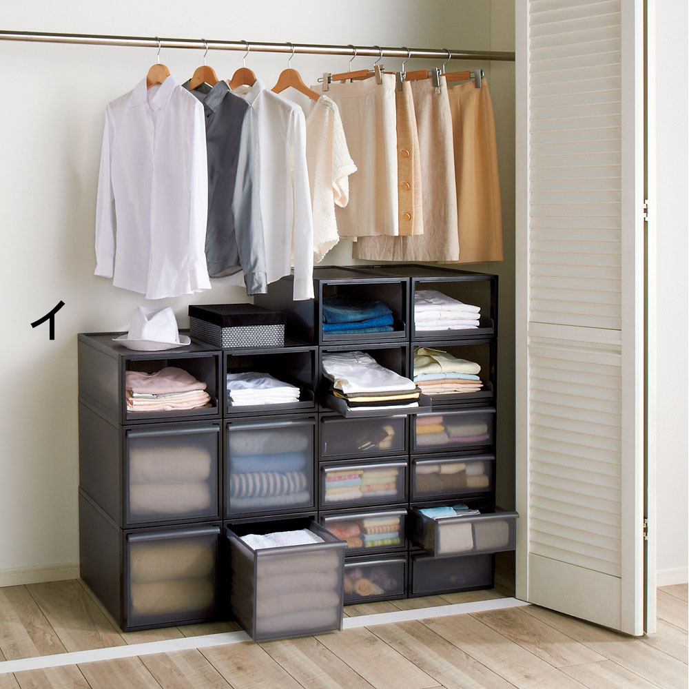 クローゼットにぴったりサイズに作られた衣装ケースタイプの収納システム