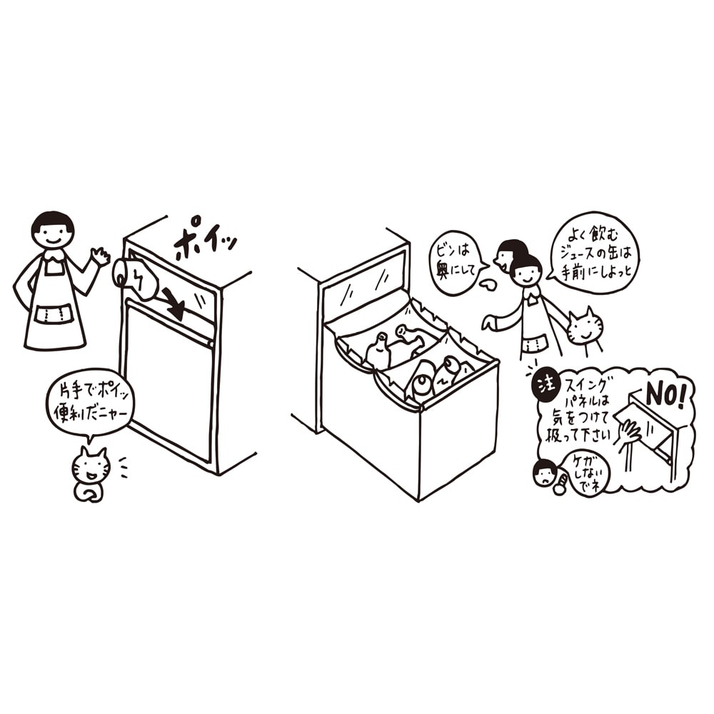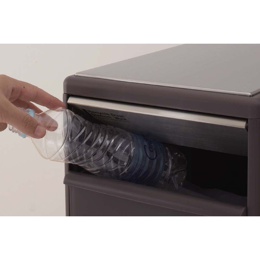 上段は缶などの投入口を隠したスイング扉。引き出しの内部はレジ袋をかけて分別できます。