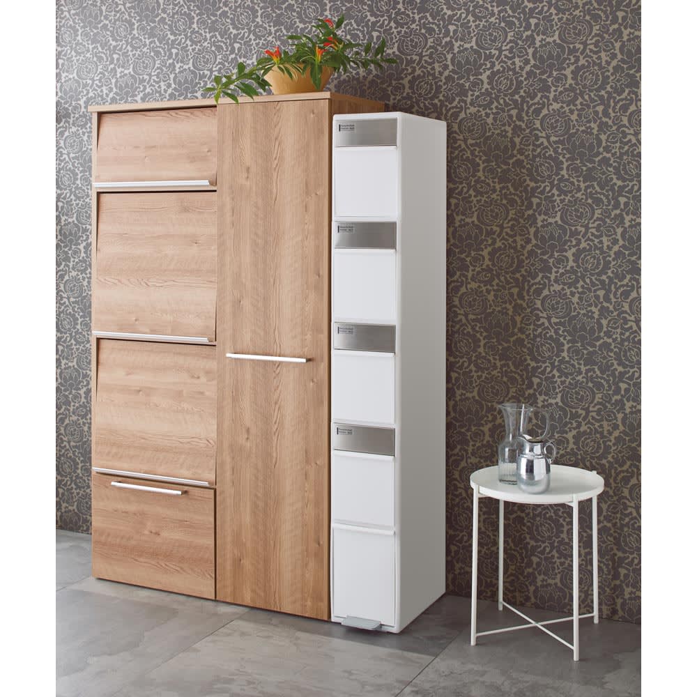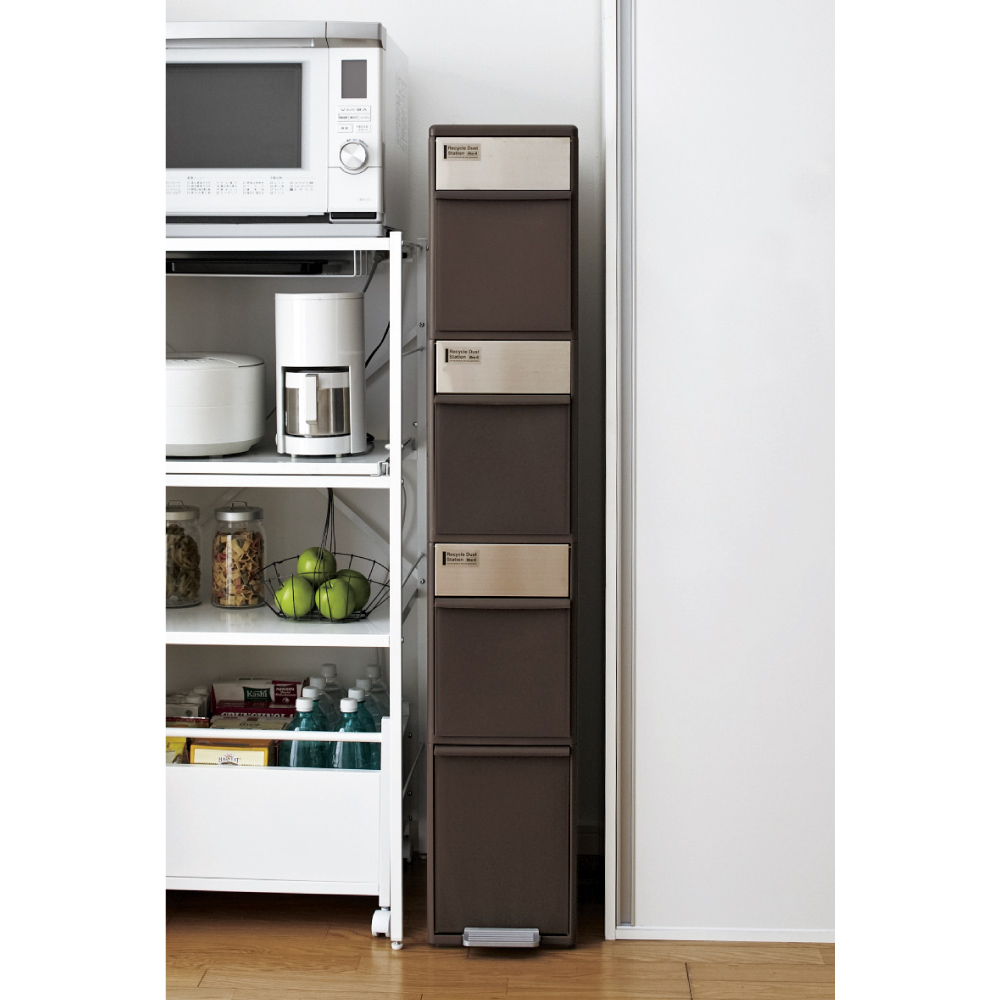 場所をとらない、上方向の空間を有効に使える隙間型・縦型(タワー型)分別で、せまい幅でもしっかり多分別が可能なキッチンダストボックスです。