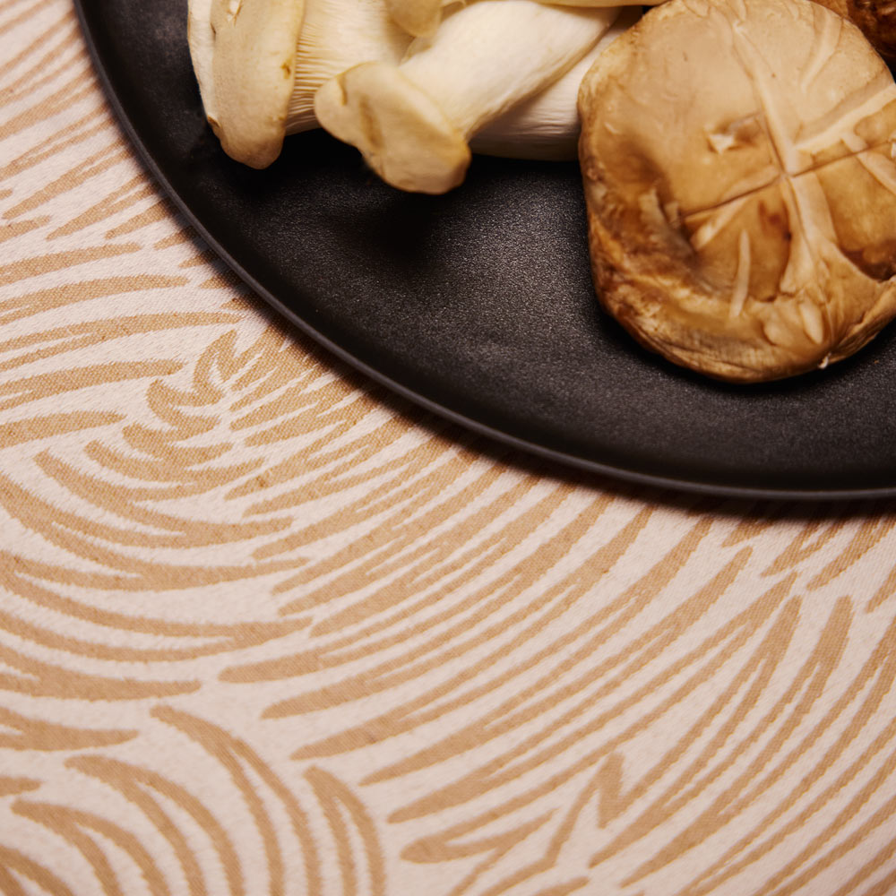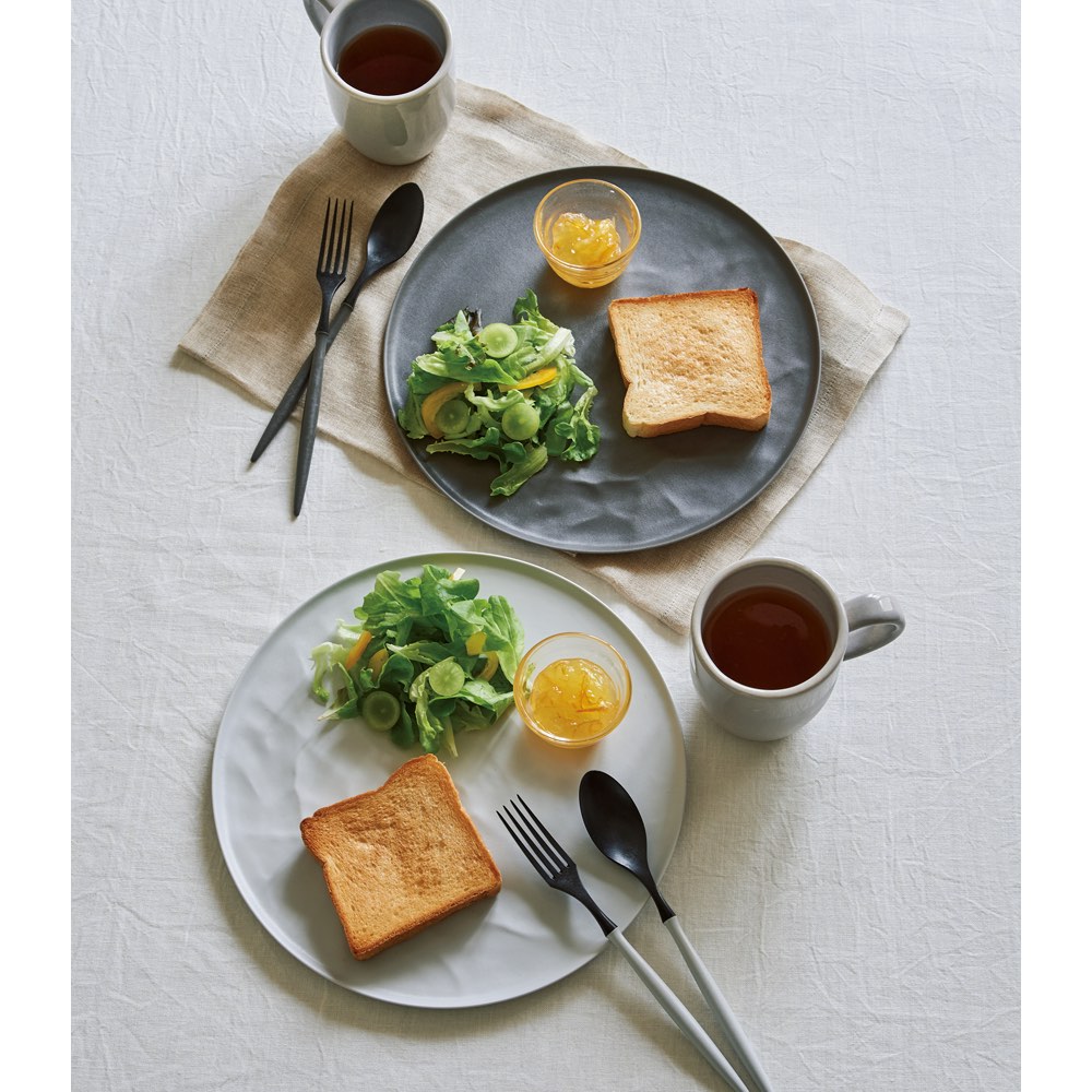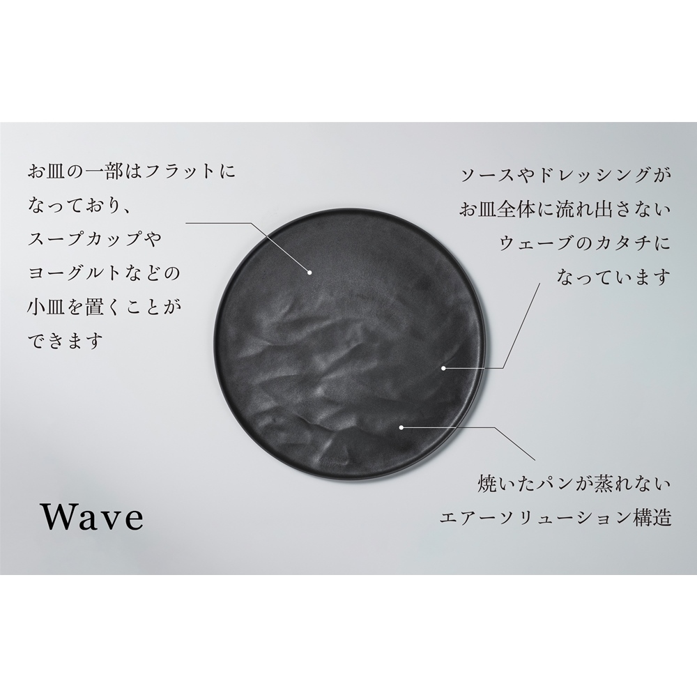 よく見ると皿の一部(写真だとお皿の上側)はフラットになっており、スープカップやヨーグルトなどの小皿を置くことができます。ソースやドレッシングがお皿全体に流れ出さないウェーブのカタチになっています。