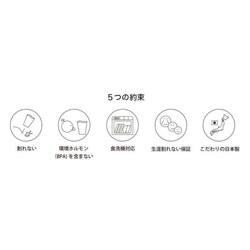 まるで本物のガラスのようにクリアですが、実は強度と透明度が高い「トライタン」という樹脂製です。うっかり手が滑っても大丈夫。1000回落としても割れないほどの丈夫さが特長です。お子さまがいるご家庭やアウトドアなど、毎日の様々なシーンで安心してお使いいただけます。安心と誇りの日本製