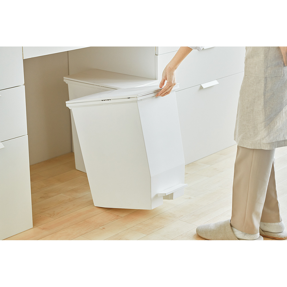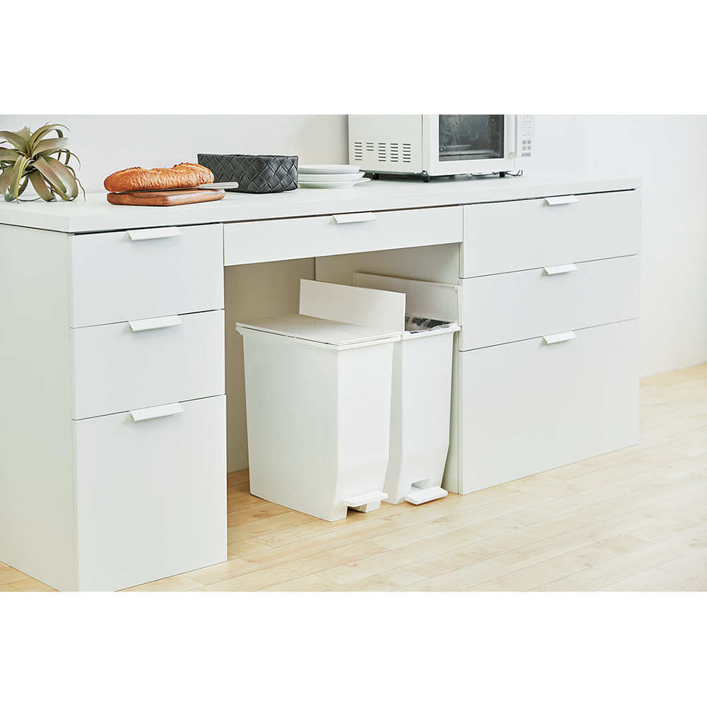●35リットル(幅22cm奥行42.5cm高さ48cm)の2個組。スリムなので、キッチンのすき間などでも活躍します。ダイニングテーブル下でも蓋が開閉する高さです。