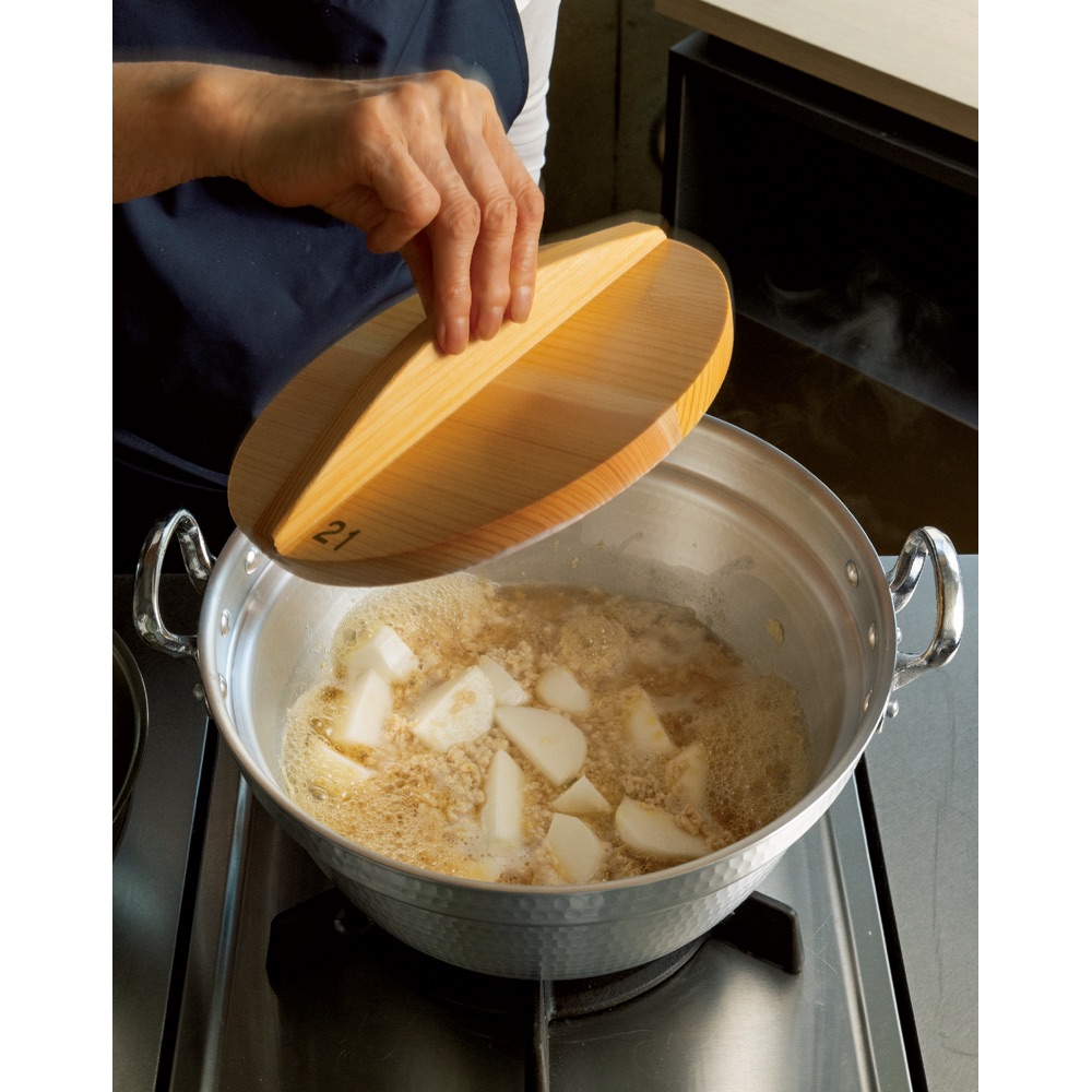 煮物を作るときにある本当に便利な落としぶた。材料の上に直接のせることで、沸き上がった煮汁がふたに当たって落ち、味が全体にいきわたります。また急に煮詰まって焦げる失敗も軽減します。また煮汁の中で材料が浮いたり、煮くずれるのを防ぐ役割もあります。