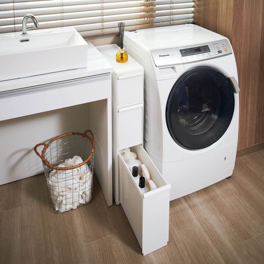 • 使用イメージ(ア)ホワイト ロータイプは天板上に物が置け、洗面所にも! ※写真は別売りのロータイプ高さ90cm幅17cmです。
