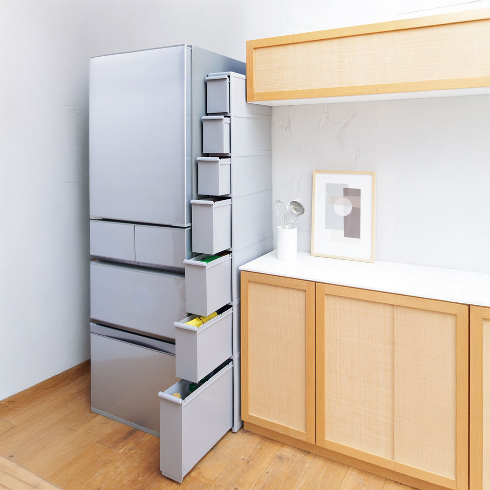 • 4~6段目の引き出しは、インスタント食品などが入る高さ設計です。 ※写真の引き出しは別売りの幅25.5cmタイプ(イ)ベージュです。お届けする商品は幅14cmタイプになります。