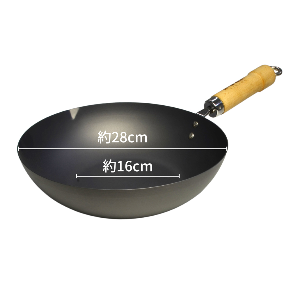 フライパン炒め鍋28cm=外径28cm、底面直径16cm、全長47.5cm、深さ7.5cm、重さ1130g