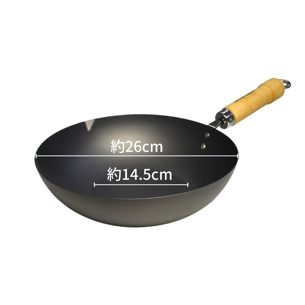 フライパン炒め鍋26cm=外径26cm、底面直径14.5cm、全長45.5cm、深さ7cm、重さ990g