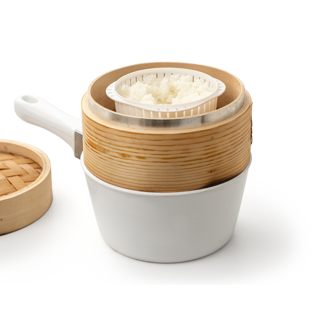 ちょっと多めだけど大きすぎない。手に馴染む形で、片手でも扱いやすいサイズ感です。美味しさの秘密は「ザル型2重構造」なので余分な水分が下に落ちてご飯がベタつかない。蒸気が循環してムラなくふっくら仕上がる。中の熱が直接外に伝わらないので加熱後も熱々にならない。