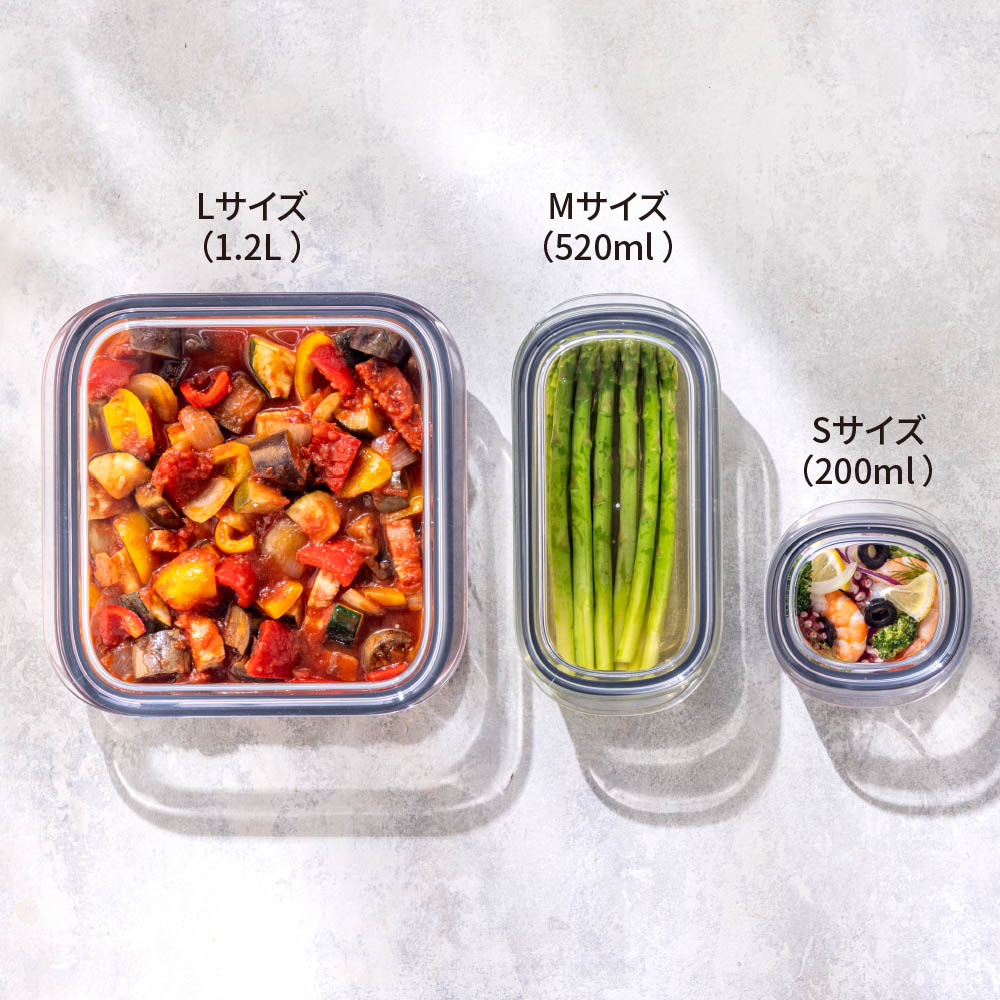 Sサイズは少し残ったおかずの保存にぴったり。Mサイズはアスパラなどの長さのある食材も収まります。お弁当箱代わりにも使えて便利。Lサイズはメインのおかずや作り置きを入れるのにちょうどいい大きさで、ご飯なら約3膳分を入れられます。