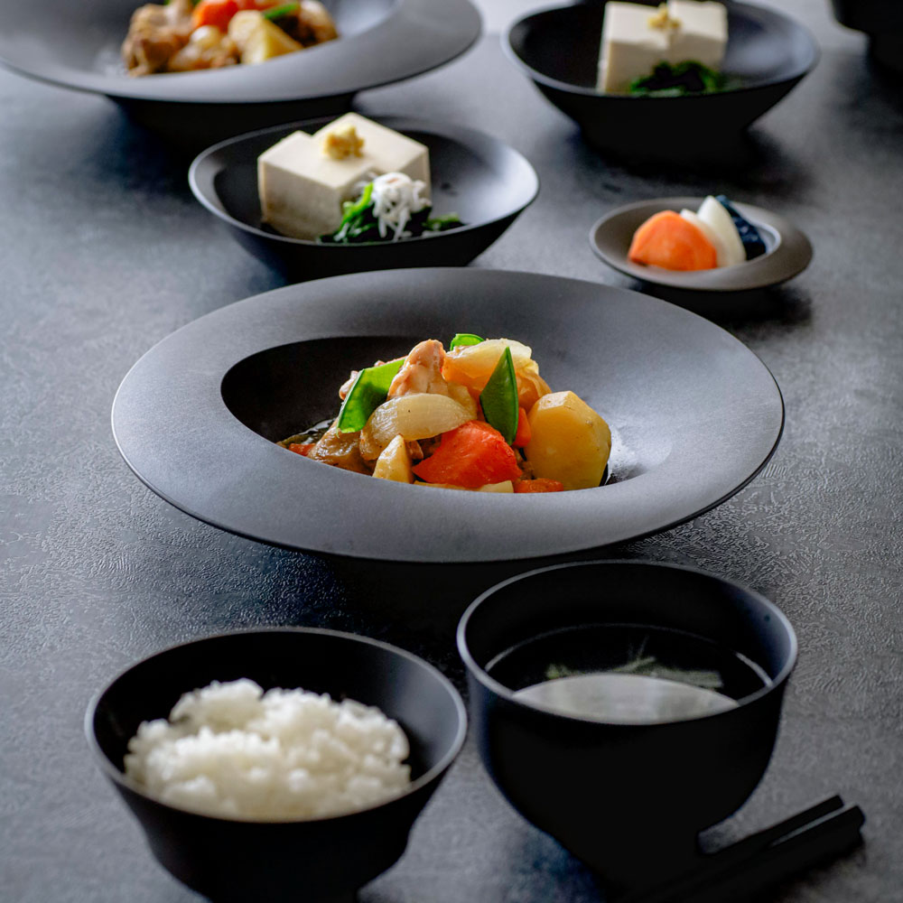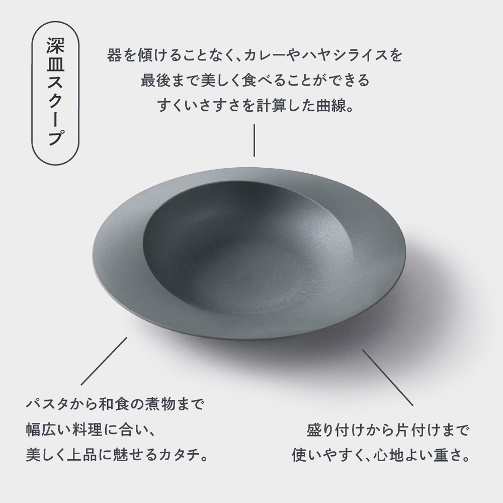 深めの設計が特徴の深皿スクープは、シチューやカレー、パスタなど、汁気のある料理も安心して盛り付けられます。片方の立ち上がりがあることで料理の立体感が増し、テーブルに華やかさをプラス。器を傾けることなく最後の一口まで美しく食べることができます。和食も美しく引き立てる和食器