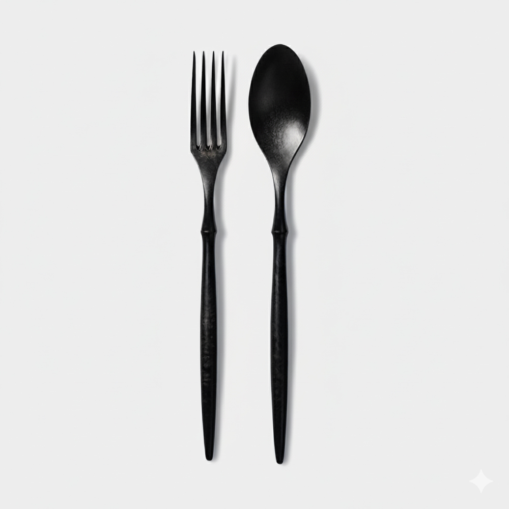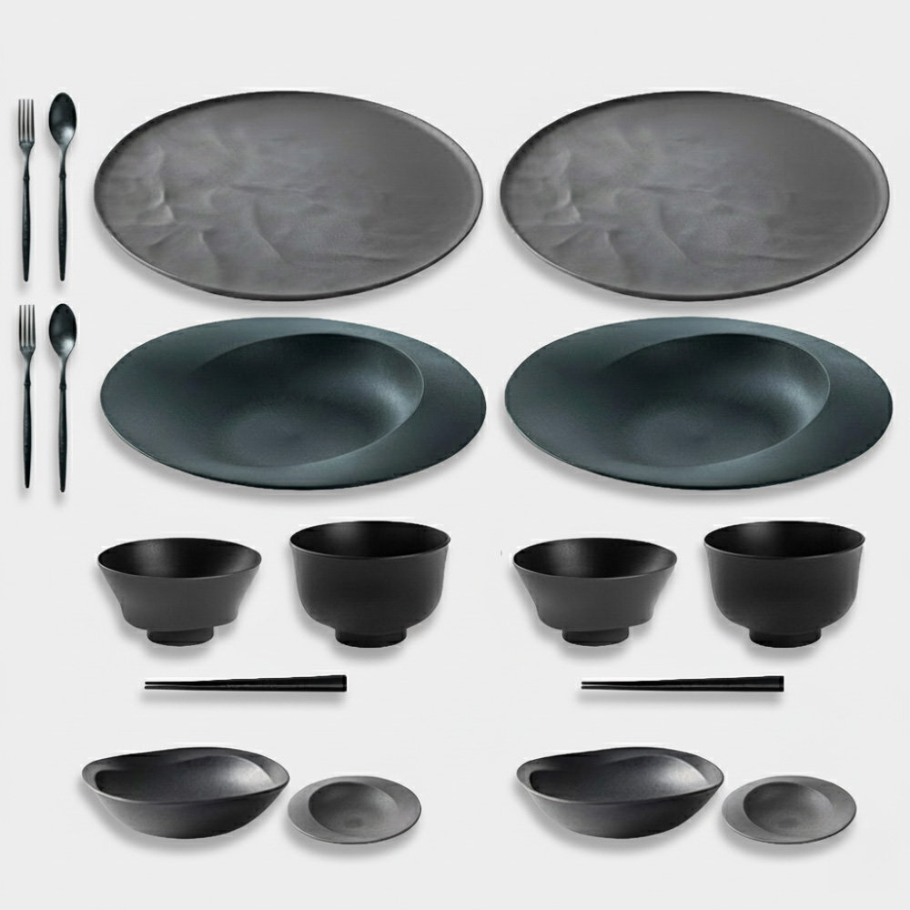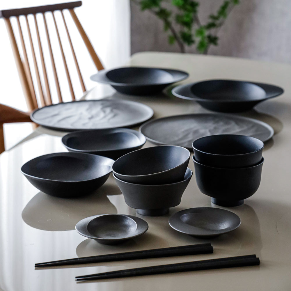 スプーン&フォーク(ブラック) 大皿ウェーブ(グレー) 深皿スクープ(ブラック) お茶碗(グレー) 汁椀(ブラック) お箸(ブラック) 取り皿(ブラック) 豆皿スクープ(グレー)