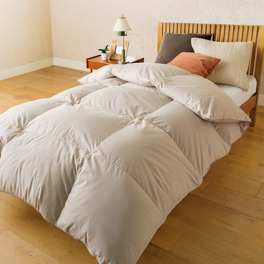 • 羽毛布団には珍しいシンプルな無地の側生地で、カバーをかけても裏うつりの心配がありません。