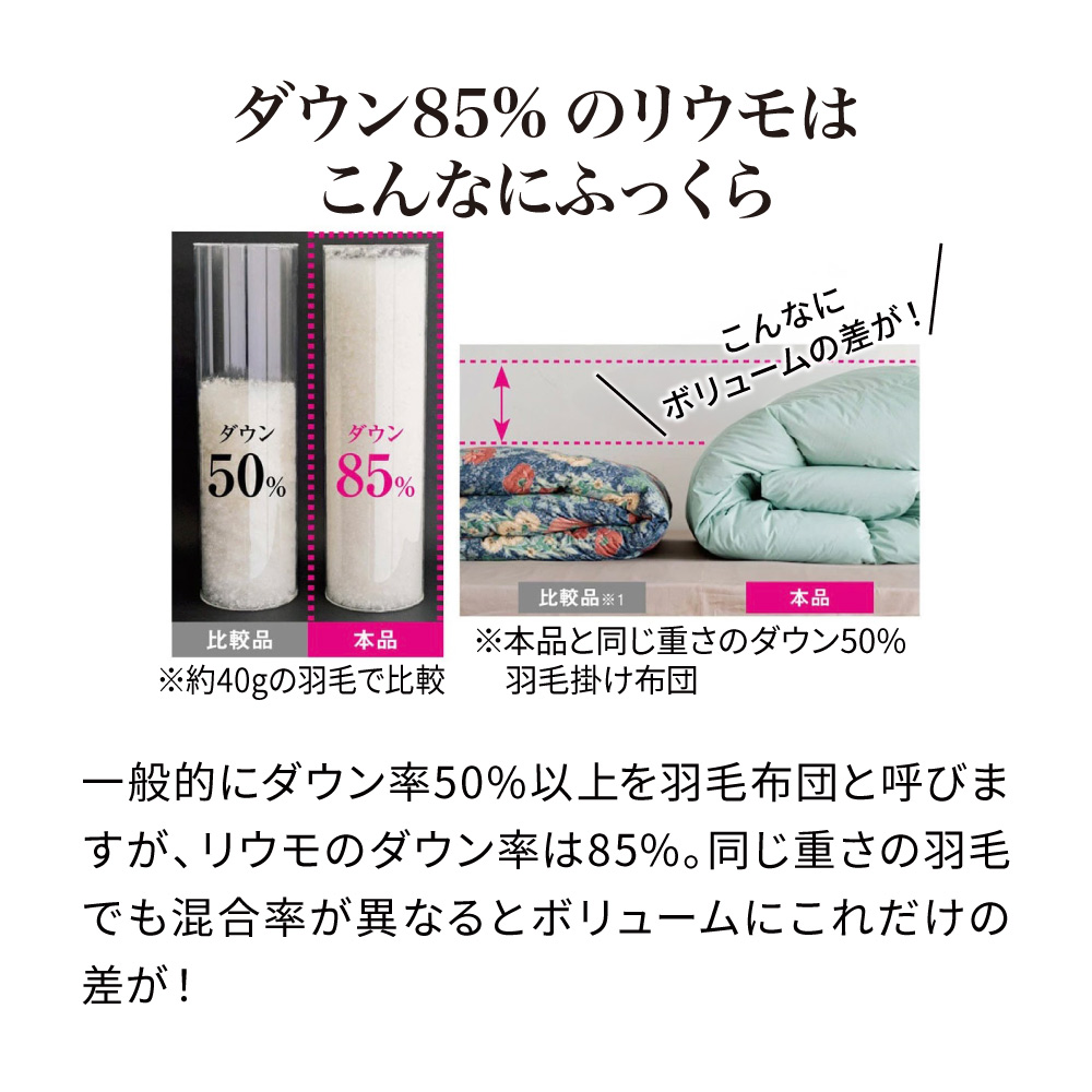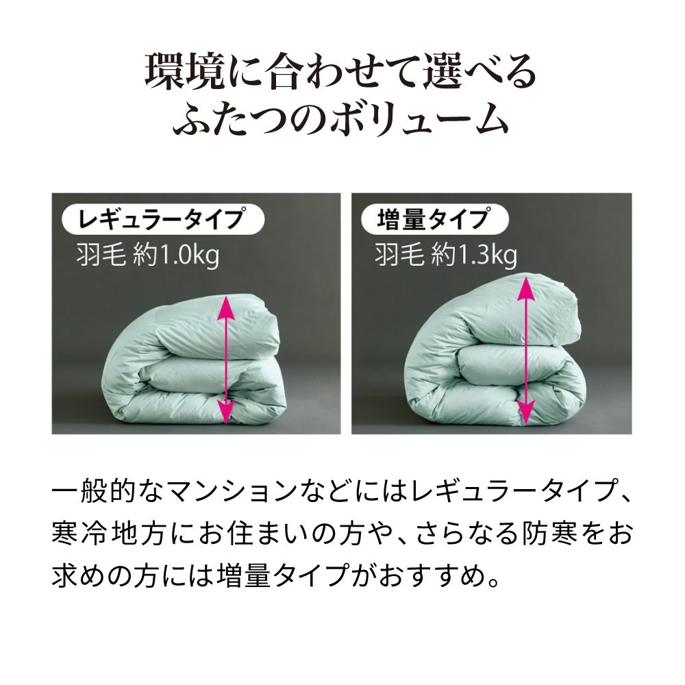• 羽毛布団には珍しいシンプルな無地の側生地で、カバーをかけても裏うつりの心配がありません。