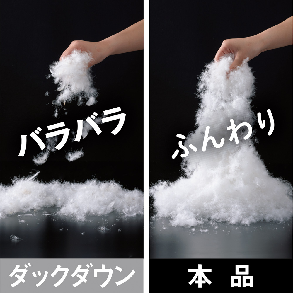 大きく成長したダウンボールは、長くしなやかな羽枝を広げ、それが複雑に絡み合うことで、弾力性と豊かなボリュームを生み出します。またあたたかさを溜めこみ、ふんわりもっちりとしたまるで雲のような掛け心地を生み出します。