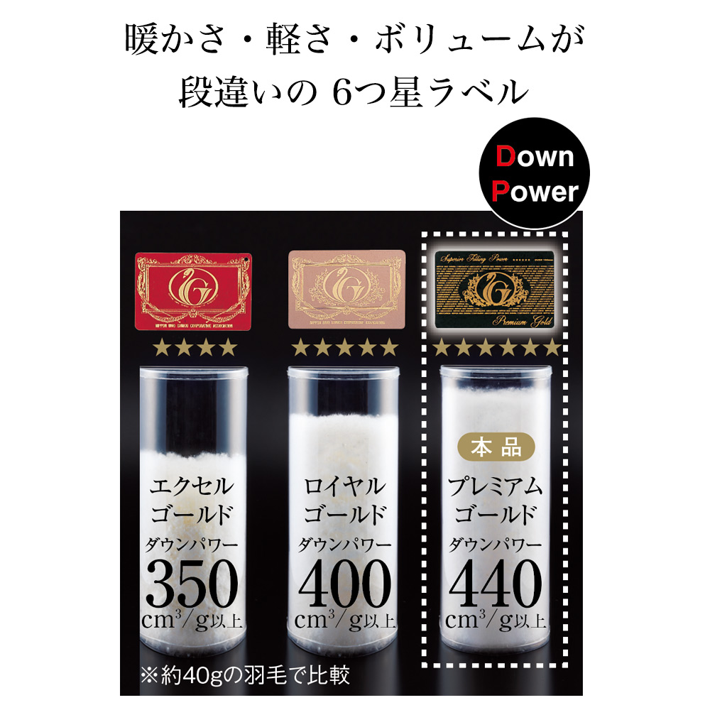 この羽毛布団は、厳格な品質基準をクリアした製品だけに与えられる「プレミアムゴールドラベル」を取得しています。中でも、ダウンパワー440?/gという最高評価の「6ツ星」ラベルは、羽毛のふくらみ、清らかさなど、細部にわたる徹底した品質管理の証です。商品画像の説明