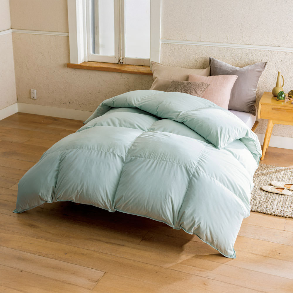 • 羽毛布団には珍しいシンプルな無地の側生地で、カバーをかけても裏うつりの心配がありません。